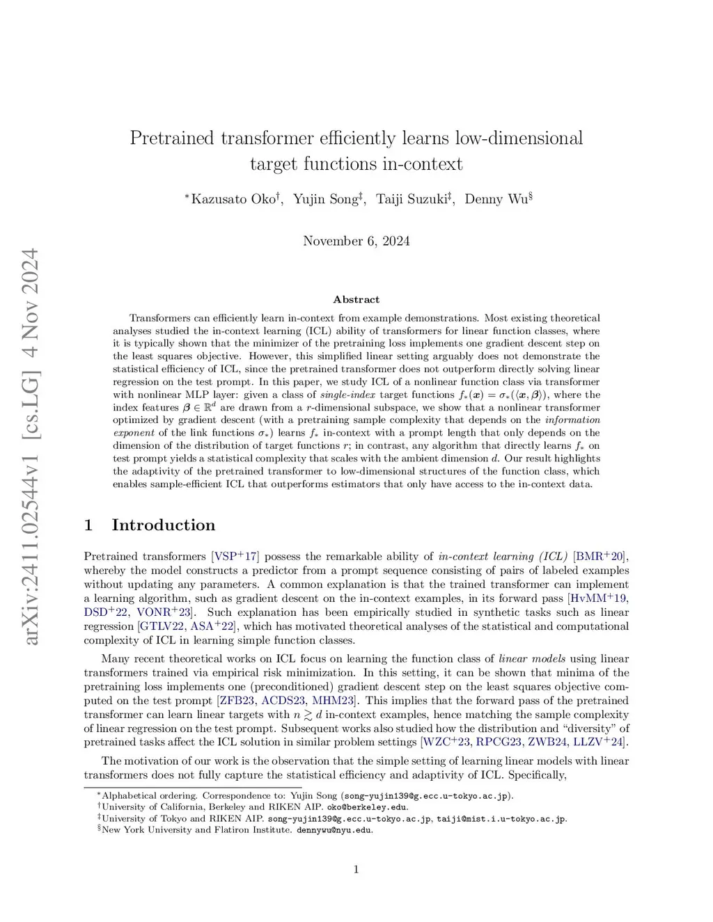 Transformers can efficiently learn in-context from example demonstrations. Most existing theoretical analyses studied the in-context learning (ICL) ability of transformers for linear function classes, where it is typically shown that the minimizer of the pretraining loss implements one gradient descent step on the least squares objective. However, this simplified linear setting arguably does not demonstrate the statistical efficiency of ICL, since the pretrained transformer does not outperform directly solving linear regression on the test prompt. In this paper, we study ICL of a nonlinear function class via transformer with nonlinear MLP layer: given a class of \textit{single-index} target functions , where the index features are drawn from a -dimensional subspace, we show that a nonlinear transformer optimized by gradient descent (with a pretraining sample complexity that depends on the \textit{information exponent} of the link functions ) learns in-context with a prompt length that only depends on the dimension of the distribution of target functions ; in contrast, any algorithm that directly learns on test prompt yields a statistical complexity that scales with the ambient dimension . Our result highlights the adaptivity of the pretrained transformer to low-dimensional structures of the function class, which enables sample-efficient ICL that outperforms estimators that only have access to the in-context data.