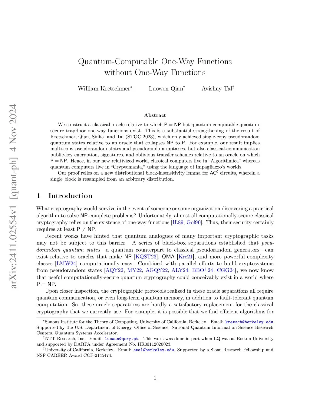 We construct a classical oracle relative to which but quantum-computable quantum-secure trapdoor one-way functions exist. This is a substantial strengthening of the result of Kretschmer, Qian, Sinha, and Tal (STOC 2023), which only achieved single-copy pseudorandom quantum states relative to an oracle that collapses to . For example, our result implies multi-copy pseudorandom states and pseudorandom unitaries, but also classical-communication public-key encryption, signatures, and oblivious transfer schemes relative to an oracle on which . Hence, in our new relativized world, classical computers live in "Algorithmica" whereas quantum computers live in "Cryptomania," using the language of Impagliazzo's worlds. Our proof relies on a new distributional block-insensitivity lemma for circuits, wherein a single block is resampled from an arbitrary distribution.