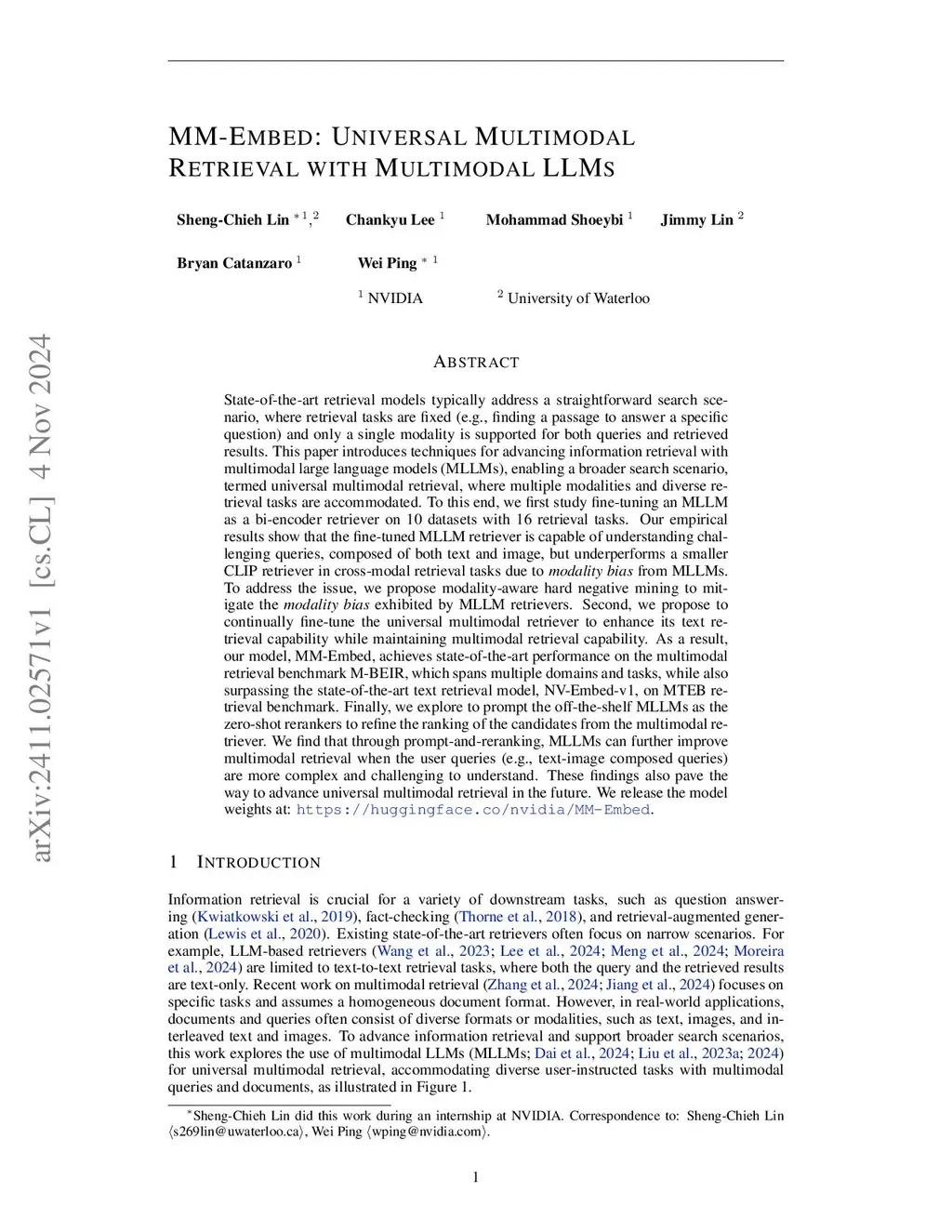 MM-Embed: Universal Multimodal Retrieval with Multimodal LLMs