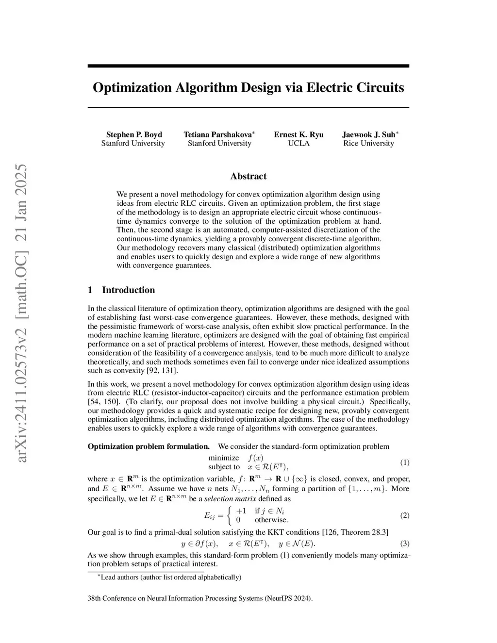 We present a novel methodology for convex optimization algorithm design using ideas from electric RLC circuits. Given an optimization problem, the first stage of the methodology is to design an appropriate electric circuit whose continuous-time dynamics converge to the solution of the optimization problem at hand. Then, the second stage is an automated, computer-assisted discretization of the continuous-time dynamics, yielding a provably convergent discrete-time algorithm. Our methodology recovers many classical (distributed) optimization algorithms and enables users to quickly design and explore a wide range of new algorithms with convergence guarantees.