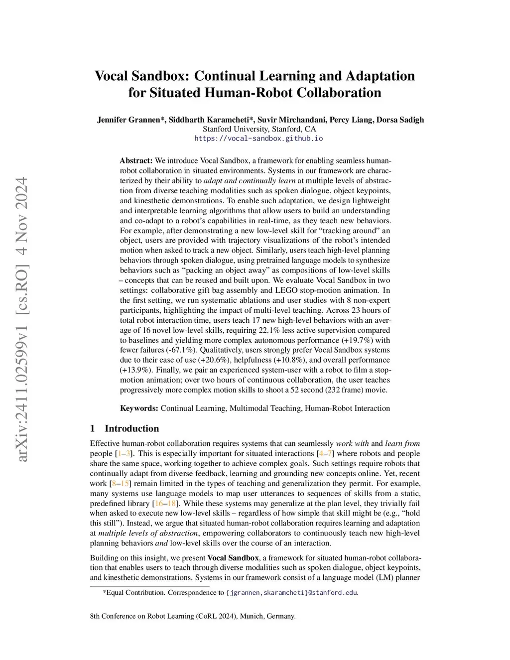 We introduce Vocal Sandbox, a framework for enabling seamless human-robot collaboration in situated environments. Systems in our framework are characterized by their ability to adapt and continually learn at multiple levels of abstraction from diverse teaching modalities such as spoken dialogue, object keypoints, and kinesthetic demonstrations. To enable such adaptation, we design lightweight and interpretable learning algorithms that allow users to build an understanding and co-adapt to a robot's capabilities in real-time, as they teach new behaviors. For example, after demonstrating a new low-level skill for "tracking around" an object, users are provided with trajectory visualizations of the robot's intended motion when asked to track a new object. Similarly, users teach high-level planning behaviors through spoken dialogue, using pretrained language models to synthesize behaviors such as "packing an object away" as compositions of low-level skills concepts that can be reused and built upon. We evaluate Vocal Sandbox in two settings: collaborative gift bag assembly and LEGO stop-motion animation. In the first setting, we run systematic ablations and user studies with 8 non-expert participants, highlighting the impact of multi-level teaching. Across 23 hours of total robot interaction time, users teach 17 new high-level behaviors with an average of 16 novel low-level skills, requiring 22.1% less active supervision compared to baselines and yielding more complex autonomous performance (+19.7%) with fewer failures (-67.1%). Qualitatively, users strongly prefer Vocal Sandbox systems due to their ease of use (+20.6%) and overall performance (+13.9%). Finally, we pair an experienced system-user with a robot to film a stop-motion animation; over two hours of continuous collaboration, the user teaches progressively more complex motion skills to shoot a 52 second (232 frame) movie.