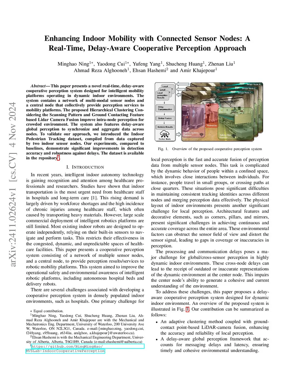 This paper presents a novel real-time, delay-aware cooperative perception system designed for intelligent mobility platforms operating in dynamic indoor environments. The system contains a network of multi-modal sensor nodes and a central node that collectively provide perception services to mobility platforms. The proposed Hierarchical Clustering Considering the Scanning Pattern and Ground Contacting Feature based Lidar Camera Fusion improve intra-node perception for crowded environment. The system also features delay-aware global perception to synchronize and aggregate data across nodes. To validate our approach, we introduced the Indoor Pedestrian Tracking dataset, compiled from data captured by two indoor sensor nodes. Our experiments, compared to baselines, demonstrate significant improvements in detection accuracy and robustness against delays. The dataset is available in the repository: https://github.com/NingMingHao/MVSLab-IndoorCooperativePerception