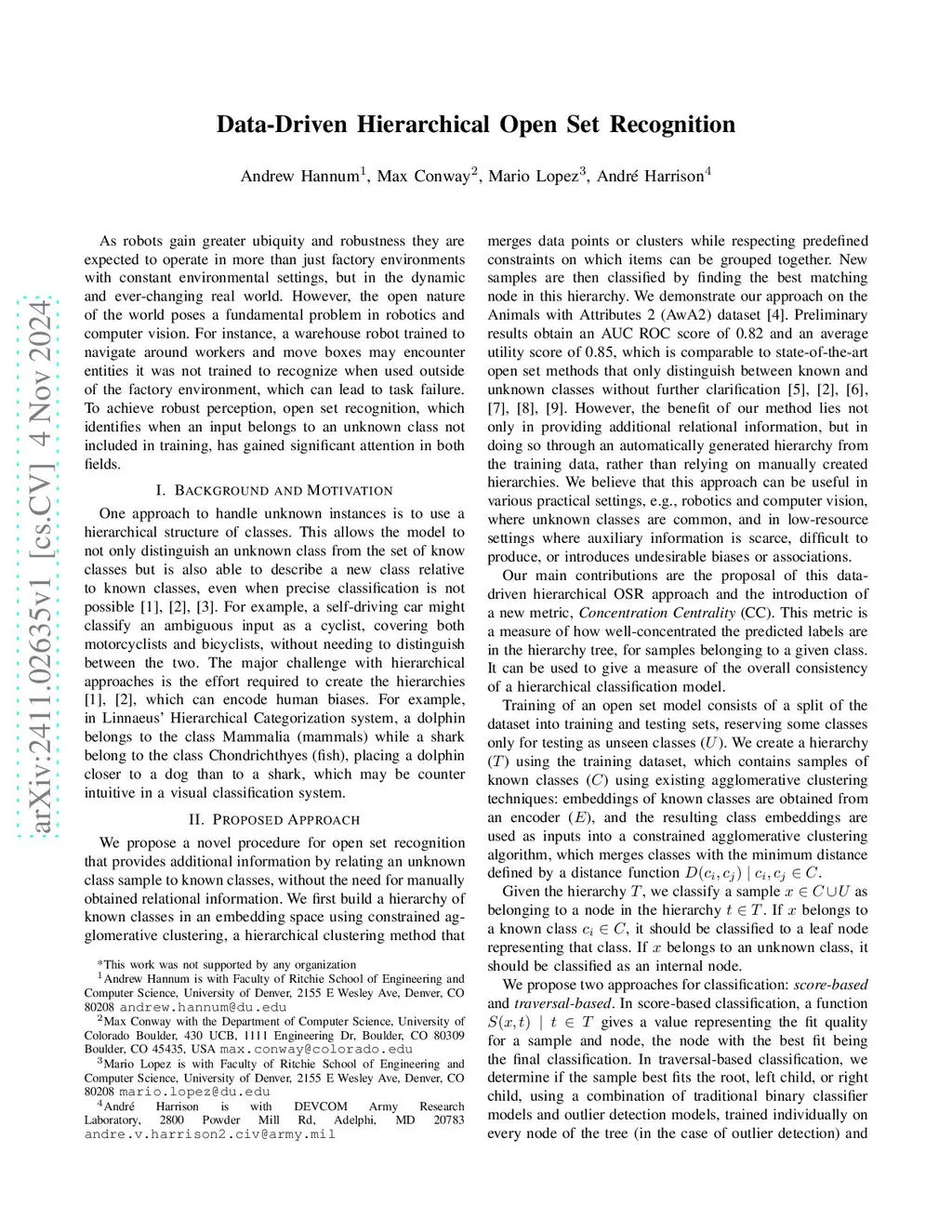 This paper presents a novel data-driven hierarchical approach to open set recognition (OSR) for robust perception in robotics and computer vision, utilizing constrained agglomerative clustering to automatically build a hierarchy of known classes in embedding space without requiring manual relational information. The method, demonstrated on the Animals with Attributes 2 (AwA2) dataset, achieves competitive results with an AUC ROC score of 0.82 and utility score of 0.85, while introducing two classification approaches (score-based and traversal-based) and a new Concentration Centrality (CC) metric for measuring hierarchical classification consistency. Although not surpassing existing models in accuracy, the approach provides valuable additional information about unknown classes through automatically generated hierarchies, requires no supplementary information beyond typical supervised model requirements, and introduces the Class Concentration Centrality (CCC) metric for evaluating unknown class placement consistency, with future work aimed at improving accuracy, validating the CC metric, and expanding to Large-Scale Open-Set Classification Protocols for ImageNet.