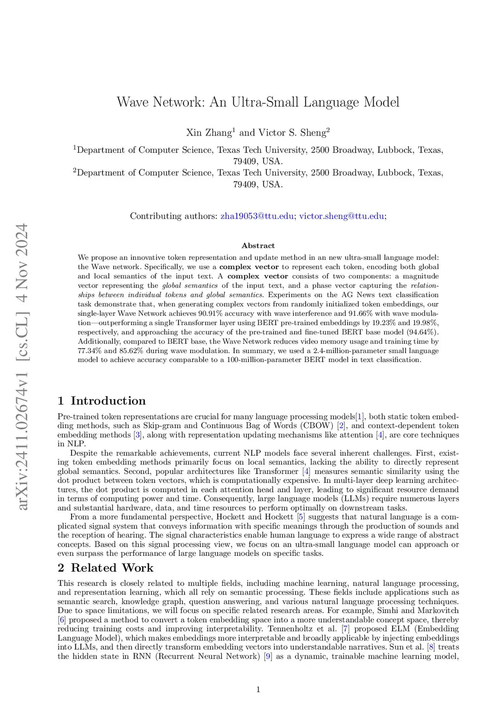 We propose an innovative token representation and update method in a new ultra-small language model: the Wave network. Specifically, we use a complex vector to represent each token, encoding both global and local semantics of the input text. A complex vector consists of two components: a magnitude vector representing the global semantics of the input text, and a phase vector capturing the relationships between individual tokens and global semantics. Experiments on the AG News text classification task demonstrate that, when generating complex vectors from randomly initialized token embeddings, our single-layer Wave Network achieves 90.91% accuracy with wave interference and 91.66% with wave modulation - outperforming a single Transformer layer using BERT pre-trained embeddings by 19.23% and 19.98%, respectively, and approaching the accuracy of the pre-trained and fine-tuned BERT base model (94.64%). Additionally, compared to BERT base, the Wave Network reduces video memory usage and training time by 77.34% and 85.62% during wave modulation. In summary, we used a 2.4-million-parameter small language model to achieve accuracy comparable to a 100-million-parameter BERT model in text classification.