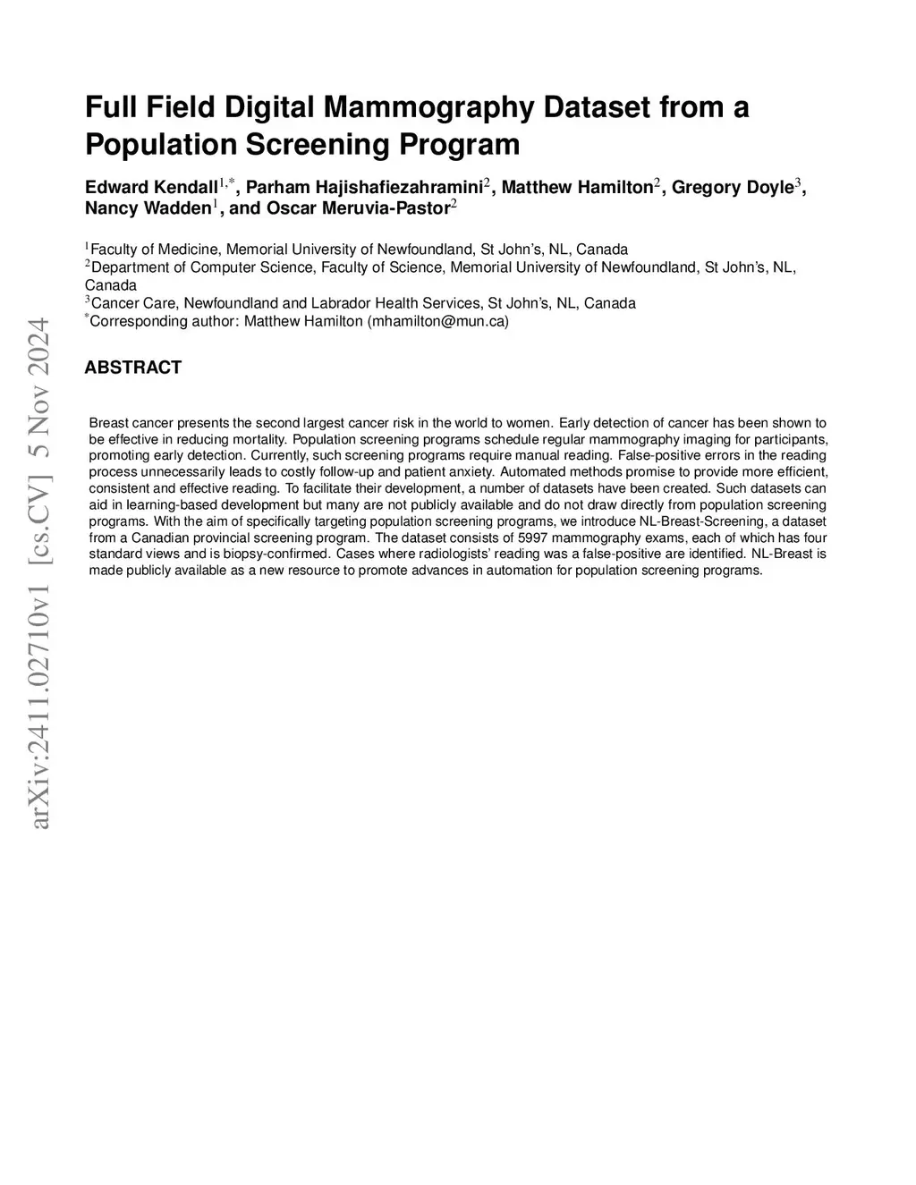 Breast cancer presents the second largest cancer risk in the world to women. Early detection of cancer has been shown to be effective in reducing mortality. Population screening programs schedule regular mammography imaging for participants, promoting early detection. Currently, such screening programs require manual reading. False-positive errors in the reading process unnecessarily leads to costly follow-up and patient anxiety. Automated methods promise to provide more efficient, consistent and effective reading. To facilitate their development, a number of datasets have been created. With the aim of specifically targeting population screening programs, we introduce NL-Breast-Screening, a dataset from a Canadian provincial screening program. The dataset consists of 5997 mammography exams, each of which has four standard views and is biopsy-confirmed. Cases where radiologist reading was a false-positive are identified. NL-Breast is made publicly available as a new resource to promote advances in automation for population screening programs.