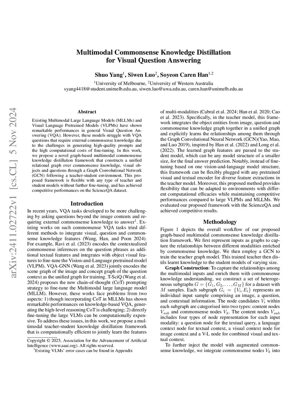 Existing Multimodal Large Language Models (MLLMs) and Visual Language Pretrained Models (VLPMs) have shown remarkable performances in the general Visual Question Answering (VQA). However, these models struggle with VQA questions that require external commonsense knowledge due to the challenges in generating high-quality prompts and the high computational costs of fine-tuning. In this work, we propose a novel graph-based multimodal commonsense knowledge distillation framework that constructs a unified relational graph over commonsense knowledge, visual objects and questions through a Graph Convolutional Network (GCN) following a teacher-student environment. This proposed framework is flexible with any type of teacher and student models without further fine-tuning, and has achieved competitive performances on the ScienceQA dataset.
