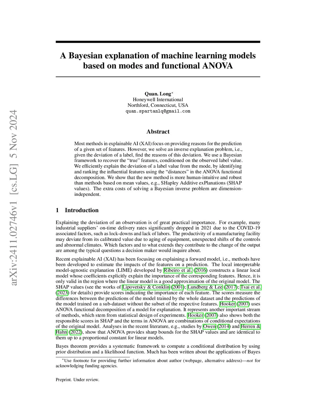 Most methods in explainable AI (XAI) focus on providing reasons for the prediction of a given set of features. However, we solve an inverse explanation problem, i.e., given the deviation of a label, find the reasons of this deviation. We use a Bayesian framework to recover the ``true'' features, conditioned on the observed label value. We efficiently explain the deviation of a label value from the mode, by identifying and ranking the influential features using the ``distances'' in the ANOVA functional decomposition. We show that the new method is more human-intuitive and robust than methods based on mean values, e.g., SHapley Additive exPlanations (SHAP values). The extra costs of solving a Bayesian inverse problem are dimension-independent.