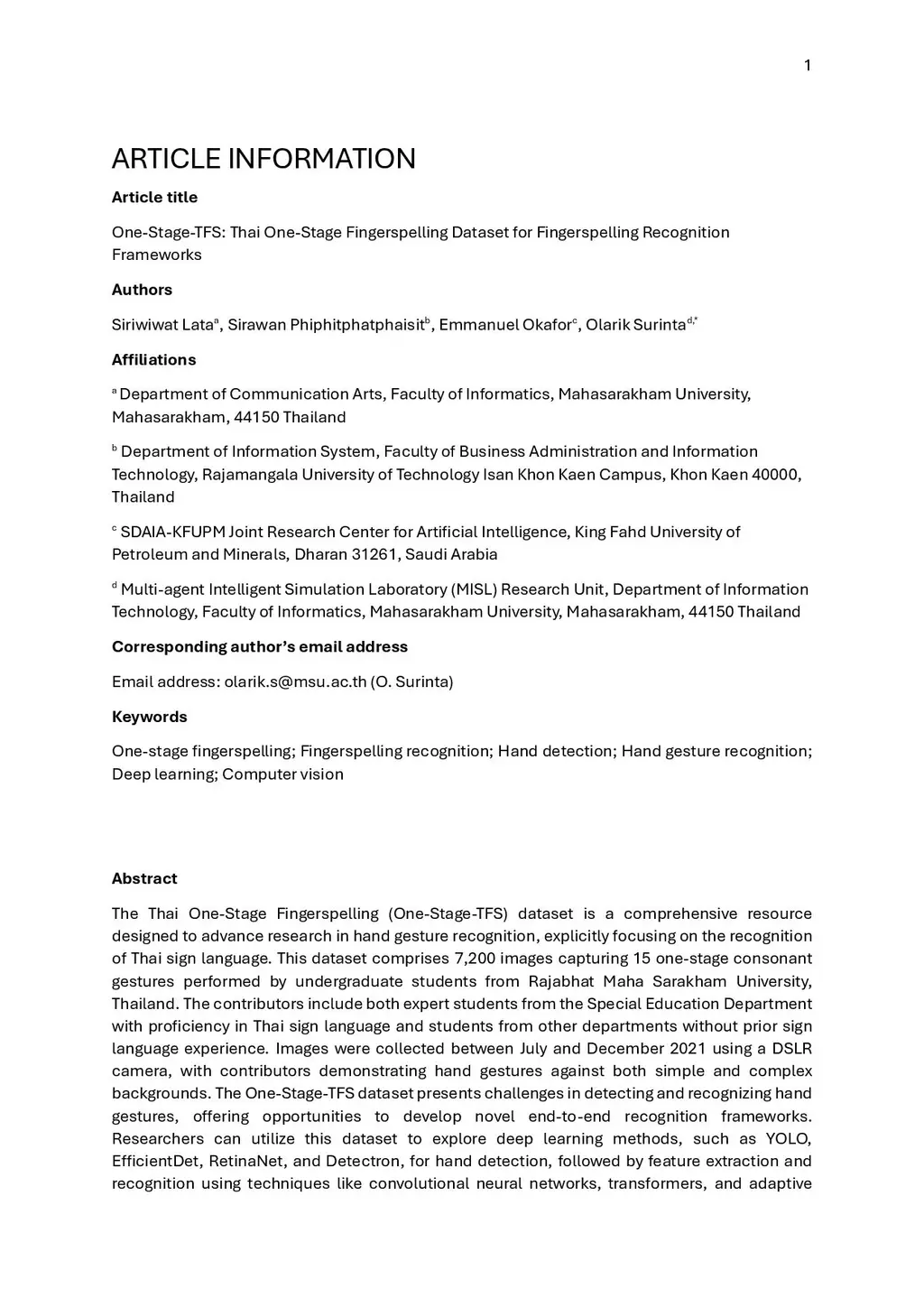 The Thai One-Stage Fingerspelling (One-Stage-TFS) dataset is a comprehensive resource designed to advance research in hand gesture recognition, explicitly focusing on the recognition of Thai sign language. This dataset comprises 7,200 images capturing 15 one-stage consonant gestures performed by undergraduate students from Rajabhat Maha Sarakham University, Thailand. The contributors include both expert students from the Special Education Department with proficiency in Thai sign language and students from other departments without prior sign language experience. Images were collected between July and December 2021 using a DSLR camera, with contributors demonstrating hand gestures against both simple and complex backgrounds. The One-Stage-TFS dataset presents challenges in detecting and recognizing hand gestures, offering opportunities to develop novel end-to-end recognition frameworks. Researchers can utilize this dataset to explore deep learning methods, such as YOLO, EfficientDet, RetinaNet, and Detectron, for hand detection, followed by feature extraction and recognition using techniques like convolutional neural networks, transformers, and adaptive feature fusion networks. The dataset is accessible via the Mendeley Data repository and supports a wide range of applications in computer science, including deep learning, computer vision, and pattern recognition, thereby encouraging further innovation and exploration in these fields.