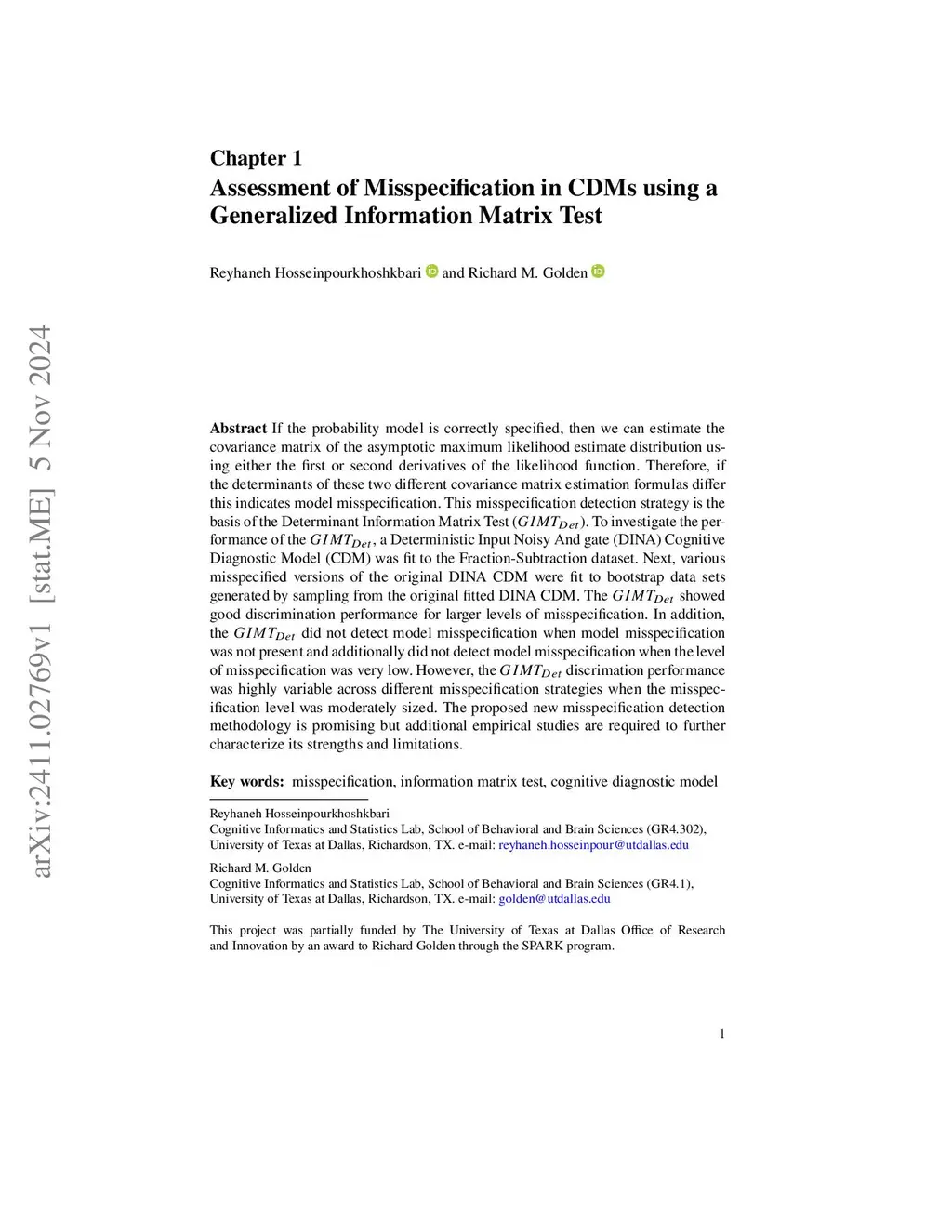 If the probability model is correctly specified, then we can estimate the covariance matrix of the asymptotic maximum likelihood estimate distribution using either the first or second derivatives of the likelihood function. Therefore, if the determinants of these two different covariance matrix estimation formulas differ this indicates model misspecification. This misspecification detection strategy is the basis of the Determinant Information Matrix Test (). To investigate the performance of the , a Deterministic Input Noisy And gate (DINA) Cognitive Diagnostic Model (CDM) was fit to the Fraction-Subtraction dataset. Next, various misspecified versions of the original DINA CDM were fit to bootstrap data sets generated by sampling from the original fitted DINA CDM. The showed good discrimination performance for larger levels of misspecification. In addition, the did not detect model misspecification when model misspecification was not present and additionally did not detect model misspecification when the level of misspecification was very low. However, the discrimation performance was highly variable across different misspecification strategies when the misspecification level was moderately sized. The proposed new misspecification detection methodology is promising but additional empirical studies are required to further characterize its strengths and limitations.