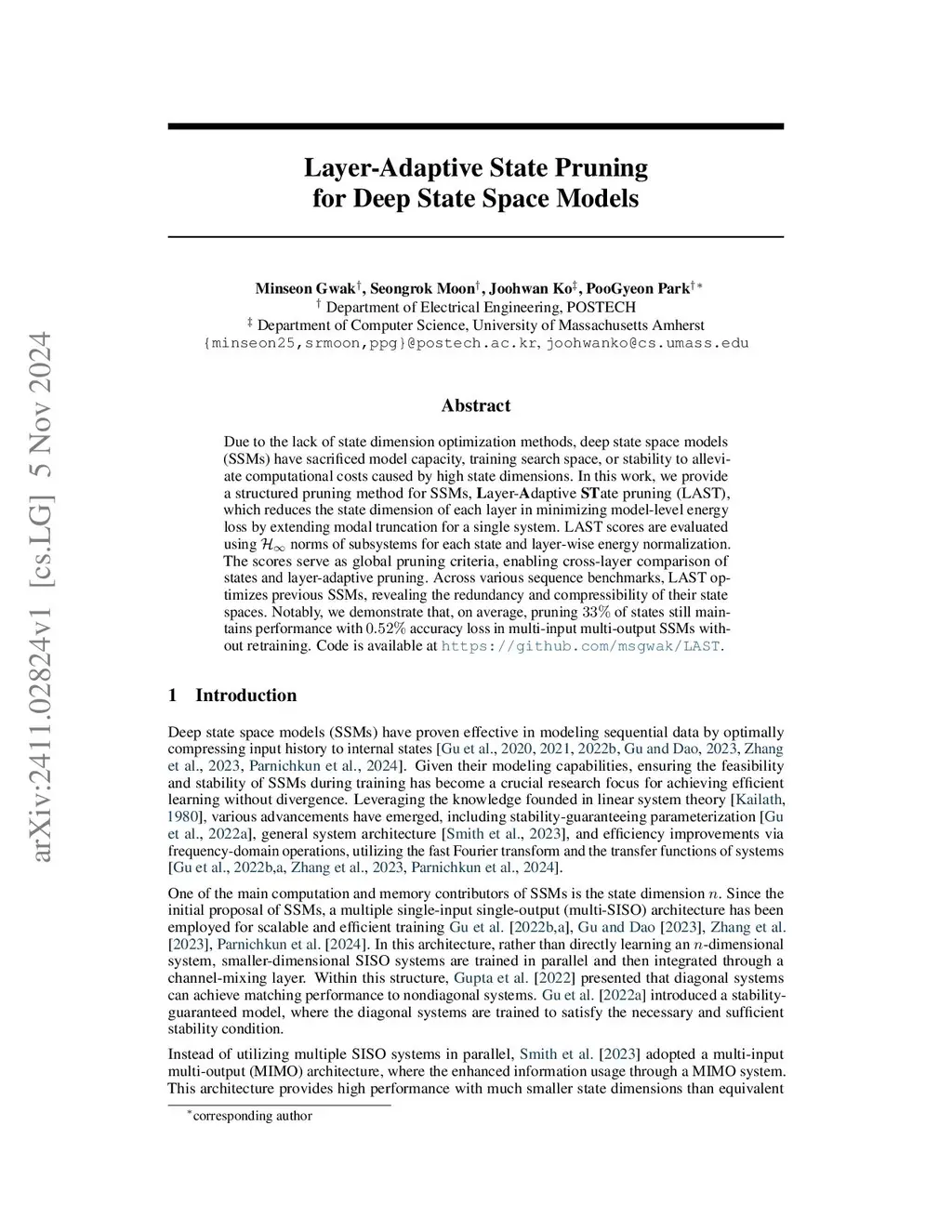 Due to the lack of state dimension optimization methods, deep state space models (SSMs) have sacrificed model capacity, training search space, or stability to alleviate computational costs caused by high state dimensions. In this work, we provide a structured pruning method for SSMs, Layer-Adaptive STate pruning (LAST), which reduces the state dimension of each layer in minimizing model-level output energy loss by extending modal truncation for a single system. LAST scores are evaluated using the norms of subsystems and layer-wise energy normalization. The scores serve as global pruning criteria, enabling cross-layer comparison of states and layer-adaptive pruning. Across various sequence benchmarks, LAST optimizes previous SSMs, revealing the redundancy and compressibility of their state spaces. Notably, we demonstrate that, on average, pruning 33% of states still maintains performance with 0.52% accuracy loss in multi-input multi-output SSMs without retraining. Code is available at https://github.com/msgwak/LAST.
