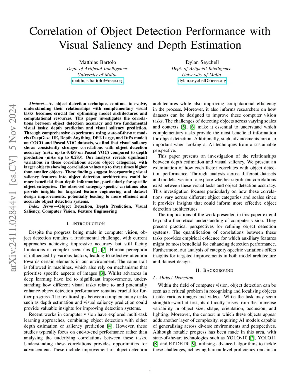 As object detection techniques continue to evolve, understanding their relationships with complementary visual tasks becomes crucial for optimising model architectures and computational resources. This paper investigates the correlations between object detection accuracy and two fundamental visual tasks: depth prediction and visual saliency prediction. Through comprehensive experiments using state-of-the-art models (DeepGaze IIE, Depth Anything, DPT-Large, and Itti's model) on COCO and Pascal VOC datasets, we find that visual saliency shows consistently stronger correlations with object detection accuracy (mA up to 0.459 on Pascal VOC) compared to depth prediction (mA up to 0.283). Our analysis reveals significant variations in these correlations across object categories, with larger objects showing correlation values up to three times higher than smaller objects. These findings suggest incorporating visual saliency features into object detection architectures could be more beneficial than depth information, particularly for specific object categories. The observed category-specific variations also provide insights for targeted feature engineering and dataset design improvements, potentially leading to more efficient and accurate object detection systems.