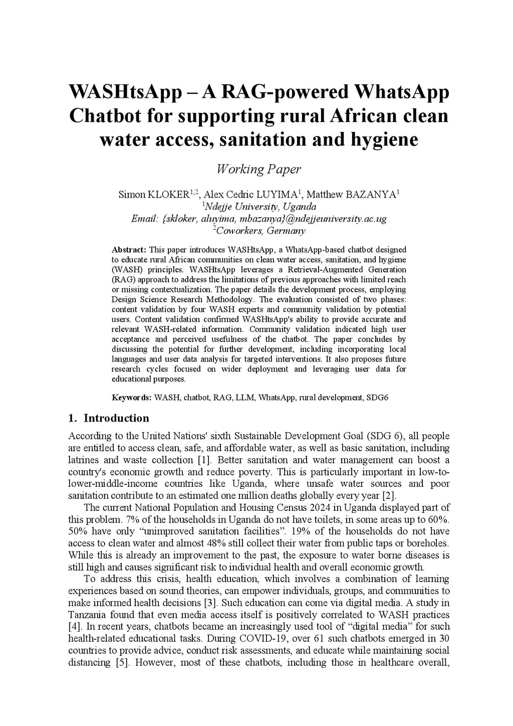 This paper introduces WASHtsApp, a WhatsApp-based chatbot designed to educate rural African communities on clean water access, sanitation, and hygiene (WASH) principles. WASHtsApp leverages a Retrieval-Augmented Generation (RAG) approach to address the limitations of previous approaches with limited reach or missing contextualization. The paper details the development process, employing Design Science Research Methodology. The evaluation consisted of two phases: content validation by four WASH experts and community validation by potential users. Content validation confirmed WASHtsApp's ability to provide accurate and relevant WASH-related information. Community validation indicated high user acceptance and perceived usefulness of the chatbot. The paper concludes by discussing the potential for further development, including incorporating local languages and user data analysis for targeted interventions. It also proposes future research cycles focused on wider deployment and leveraging user data for educational purposes.