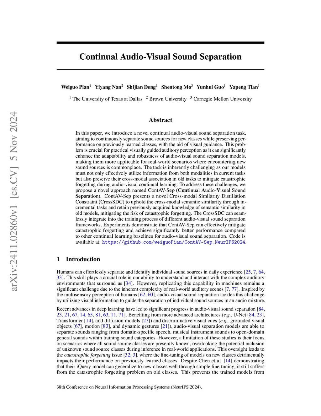 In this paper, we introduce a novel continual audio-visual sound separation task, aiming to continuously separate sound sources for new classes while preserving performance on previously learned classes, with the aid of visual guidance. This problem is crucial for practical visually guided auditory perception as it can significantly enhance the adaptability and robustness of audio-visual sound separation models, making them more applicable for real-world scenarios where encountering new sound sources is commonplace. The task is inherently challenging as our models must not only effectively utilize information from both modalities in current tasks but also preserve their cross-modal association in old tasks to mitigate catastrophic forgetting during audio-visual continual learning. To address these challenges, we propose a novel approach named ContAV-Sep (\textbf{Cont}inual \textbf{A}udio-\textbf{V}isual Sound \textbf{Sep}aration). ContAV-Sep presents a novel Cross-modal Similarity Distillation Constraint (CrossSDC) to uphold the cross-modal semantic similarity through incremental tasks and retain previously acquired knowledge of semantic similarity in old models, mitigating the risk of catastrophic forgetting. The CrossSDC can seamlessly integrate into the training process of different audio-visual sound separation frameworks. Experiments demonstrate that ContAV-Sep can effectively mitigate catastrophic forgetting and achieve significantly better performance compared to other continual learning baselines for audio-visual sound separation. Code is available at: \url{https://github.com/weiguoPian/ContAV-Sep_NeurIPS2024}.