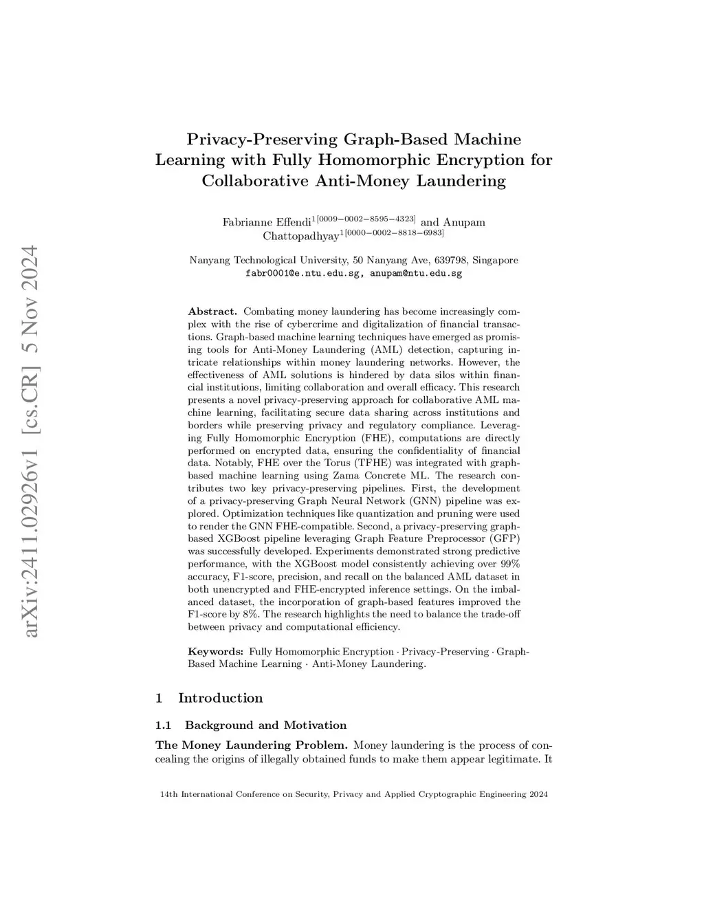 Combating money laundering has become increasingly complex with the rise of cybercrime and digitalization of financial transactions. Graph-based machine learning techniques have emerged as promising tools for Anti-Money Laundering (AML) detection, capturing intricate relationships within money laundering networks. However, the effectiveness of AML solutions is hindered by data silos within financial institutions, limiting collaboration and overall efficacy. This research presents a novel privacy-preserving approach for collaborative AML machine learning, facilitating secure data sharing across institutions and borders while preserving privacy and regulatory compliance. Leveraging Fully Homomorphic Encryption (FHE), computations are directly performed on encrypted data, ensuring the confidentiality of financial data. Notably, FHE over the Torus (TFHE) was integrated with graph-based machine learning using Zama Concrete ML. The research contributes two key privacy-preserving pipelines. First, the development of a privacy-preserving Graph Neural Network (GNN) pipeline was explored. Optimization techniques like quantization and pruning were used to render the GNN FHE-compatible. Second, a privacy-preserving graph-based XGBoost pipeline leveraging Graph Feature Preprocessor (GFP) was successfully developed. Experiments demonstrated strong predictive performance, with the XGBoost model consistently achieving over 99% accuracy, F1-score, precision, and recall on the balanced AML dataset in both unencrypted and FHE-encrypted inference settings. On the imbalanced dataset, the incorporation of graph-based features improved the F1-score by 8%. The research highlights the need to balance the trade-off between privacy and computational efficiency.