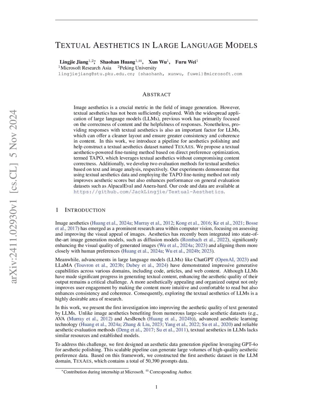 Image aesthetics is a crucial metric in the field of image generation. However, textual aesthetics has not been sufficiently explored. With the widespread application of large language models (LLMs), previous work has primarily focused on the correctness of content and the helpfulness of responses. Nonetheless, providing responses with textual aesthetics is also an important factor for LLMs, which can offer a cleaner layout and ensure greater consistency and coherence in content. In this work, we introduce a pipeline for aesthetics polishing and help construct a textual aesthetics dataset named TexAes. We propose a textual aesthetics-powered fine-tuning method based on direct preference optimization, termed TAPO, which leverages textual aesthetics without compromising content correctness. Additionally, we develop two evaluation methods for textual aesthetics based on text and image analysis, respectively. Our experiments demonstrate that using textual aesthetics data and employing the TAPO fine-tuning method not only improves aesthetic scores but also enhances performance on general evaluation datasets such as AlpacalEval and Anera-hard.