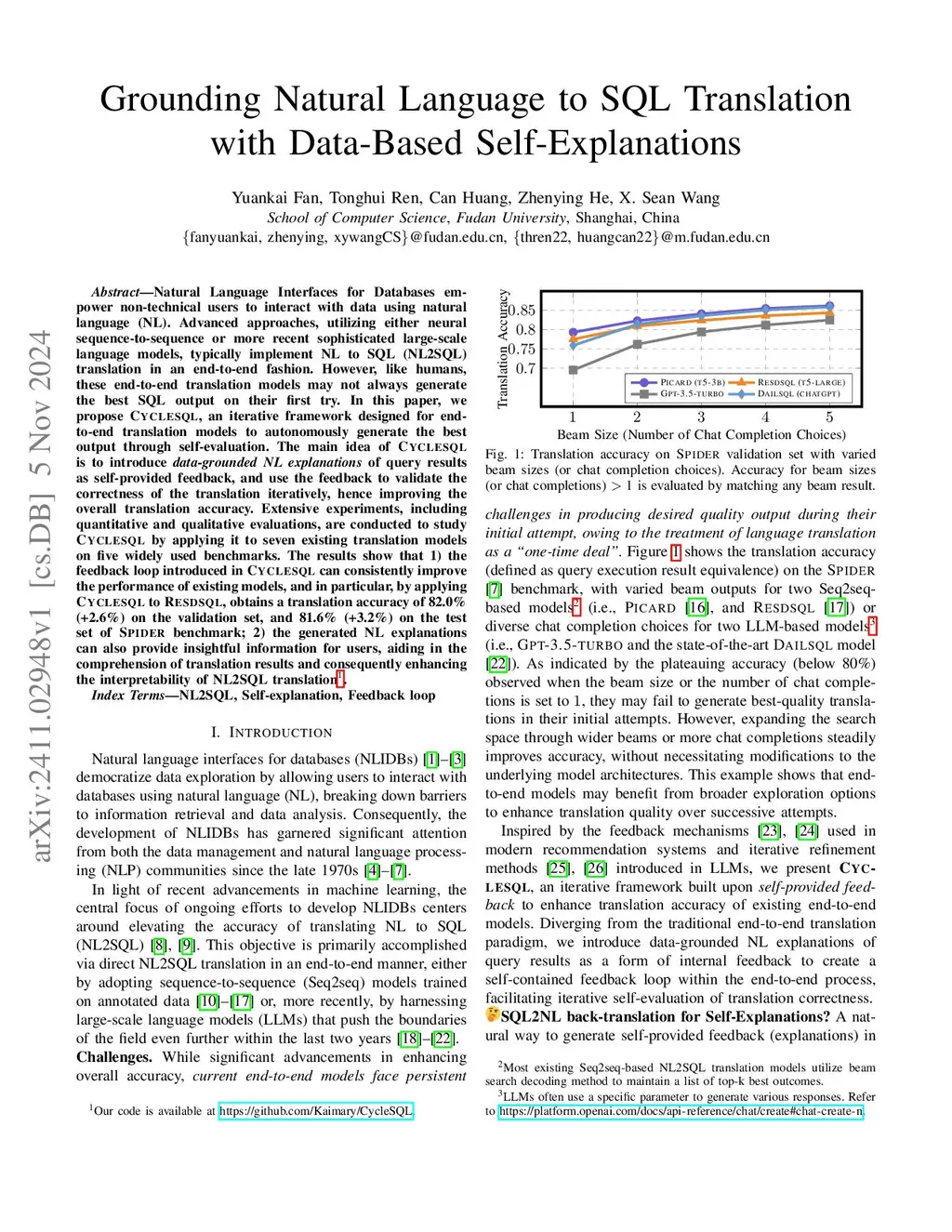Natural Language Interfaces for Databases empower non-technical users to interact with data using natural language (NL). Advanced approaches, utilizing either neural sequence-to-sequence or more recent sophisticated large-scale language models, typically implement NL to SQL (NL2SQL) translation in an end-to-end fashion. However, like humans, these end-to-end translation models may not always generate the best SQL output on their first try. In this paper, we propose CycleSQL, an iterative framework designed for end-to-end translation models to autonomously generate the best output through self-evaluation. The main idea of CycleSQL is to introduce data-grounded NL explanations of query results as self-provided feedback, and use the feedback to validate the correctness of the translation iteratively, hence improving the overall translation accuracy. Extensive experiments, including quantitative and qualitative evaluations, are conducted to study CycleSQL by applying it to seven existing translation models on five widely used benchmarks. The results show that 1) the feedback loop introduced in CycleSQL can consistently improve the performance of existing models, and in particular, by applying CycleSQL to RESDSQL, obtains a translation accuracy of 82.0% (+2.6%) on the validation set, and 81.6% (+3.2%) on the test set of Spider benchmark; 2) the generated NL explanations can also provide insightful information for users, aiding in the comprehension of translation results and consequently enhancing the interpretability of NL2SQL translation.