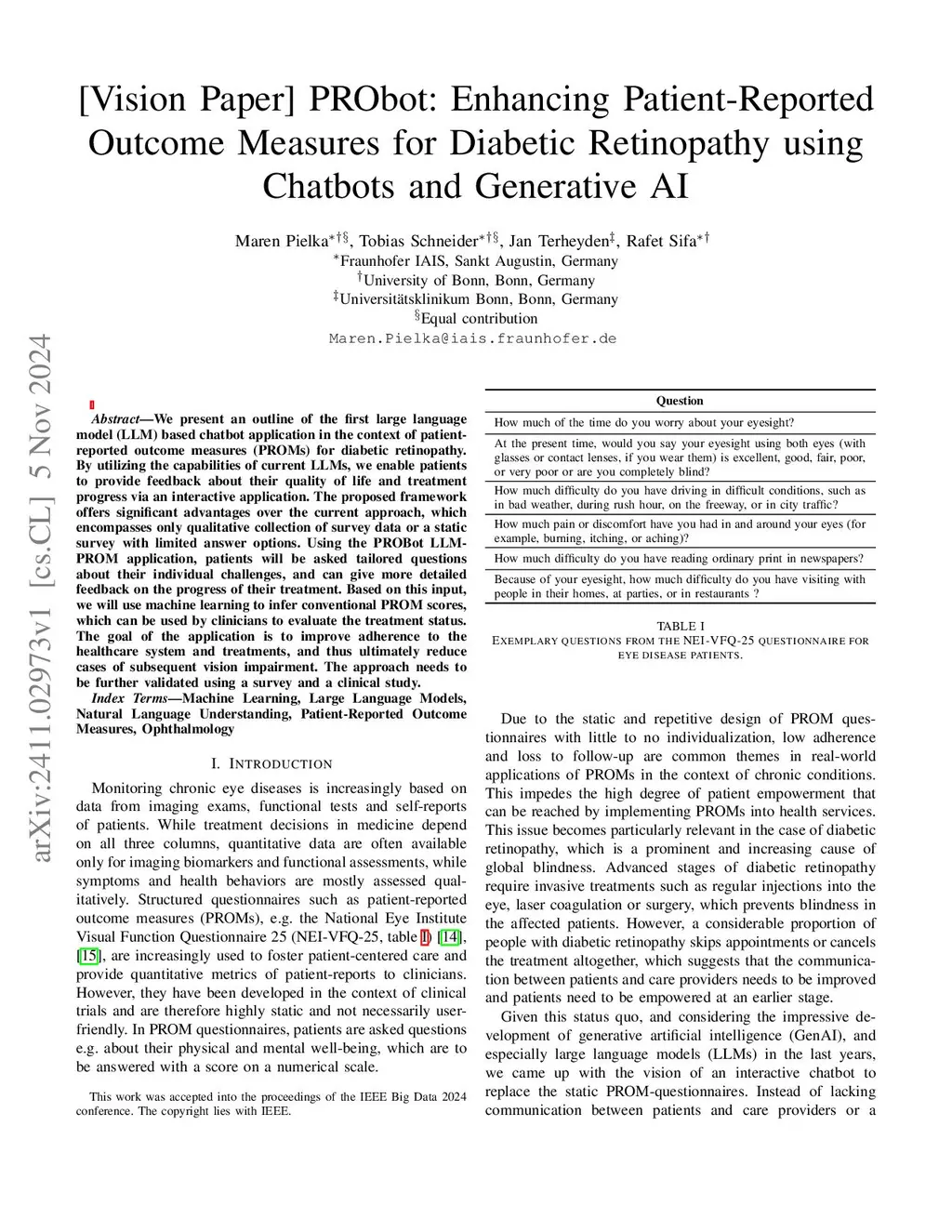 We present an outline of the first large language model (LLM) based chatbot application in the context of patient-reported outcome measures (PROMs) for diabetic retinopathy. By utilizing the capabilities of current LLMs, we enable patients to provide feedback about their quality of life and treatment progress via an interactive application. The proposed framework offers significant advantages over the current approach, which encompasses only qualitative collection of survey data or a static survey with limited answer options. Using the PROBot LLM-PROM application, patients will be asked tailored questions about their individual challenges, and can give more detailed feedback on the progress of their treatment. Based on this input, we will use machine learning to infer conventional PROM scores, which can be used by clinicians to evaluate the treatment status. The goal of the application is to improve adherence to the healthcare system and treatments, and thus ultimately reduce cases of subsequent vision impairment. The approach needs to be further validated using a survey and a clinical study.