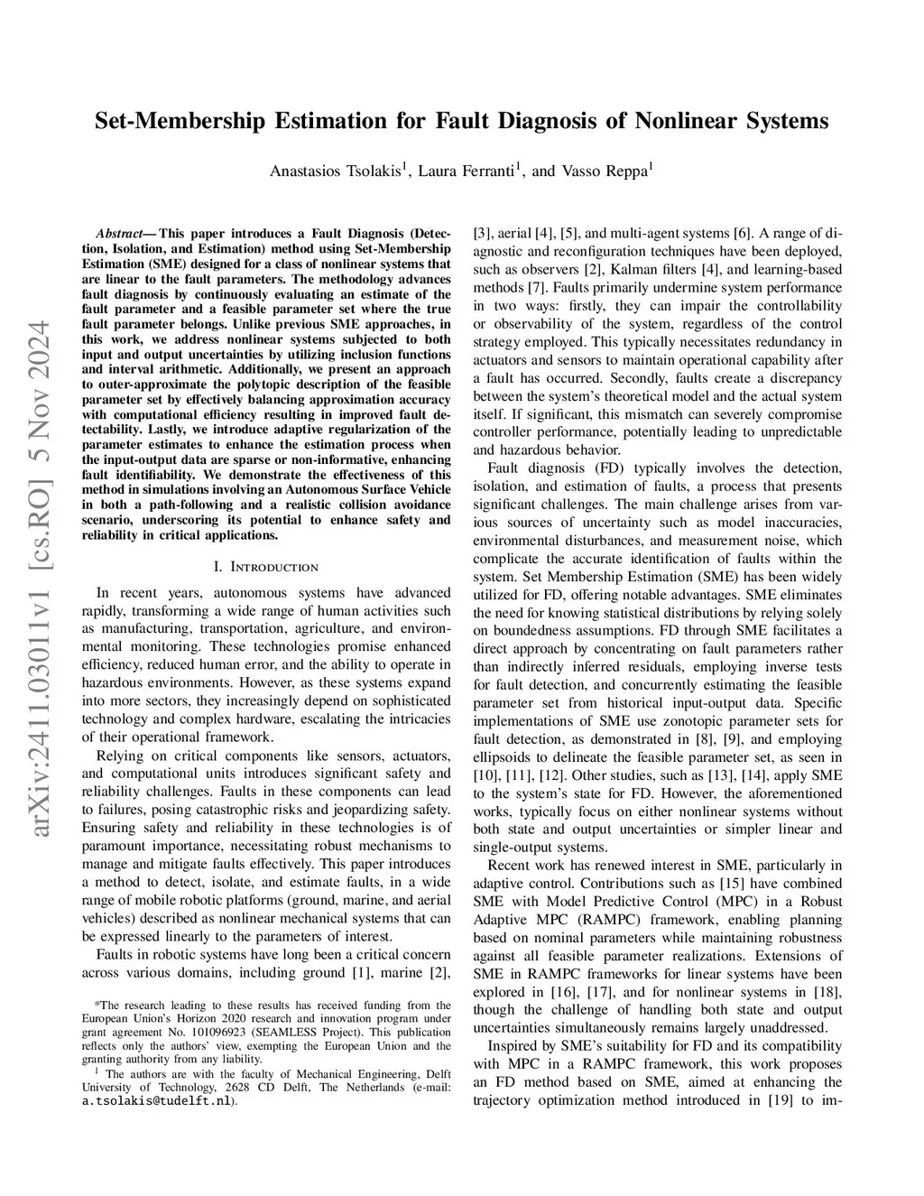 This paper introduces a Fault Diagnosis (Detection, Isolation, and Estimation) method using Set-Membership Estimation (SME) designed for a class of nonlinear systems that are linear to the fault parameters. The methodology advances fault diagnosis by continuously evaluating an estimate of the fault parameter and a feasible parameter set where the true fault parameter belongs. Unlike previous SME approaches, in this work, we address nonlinear systems subjected to both input and output uncertainties by utilizing inclusion functions and interval arithmetic. Additionally, we present an approach to outer-approximate the polytopic description of the feasible parameter set by effectively balancing approximation accuracy with computational efficiency resulting in improved fault detectability. Lastly, we introduce adaptive regularization of the parameter estimates to enhance the estimation process when the input-output data are sparse or non-informative, enhancing fault identifiability. We demonstrate the effectiveness of this method in simulations involving an Autonomous Surface Vehicle in both a path-following and a realistic collision avoidance scenario, underscoring its potential to enhance safety and reliability in critical applications.