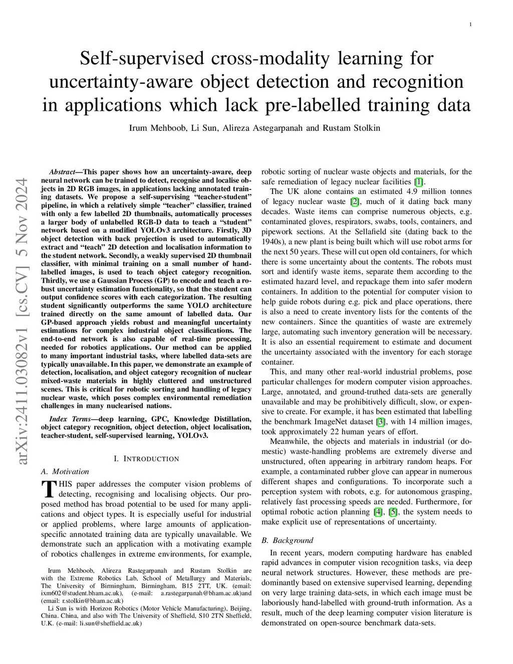 This paper shows how an uncertainty-aware, deep neural network can be trained to detect, recognise and localise objects in 2D RGB images, in applications lacking annotated train-ng datasets. We propose a self-supervising teacher-student pipeline, in which a relatively simple teacher classifier, trained with only a few labelled 2D thumbnails, automatically processes a larger body of unlabelled RGB-D data to teach a student network based on a modified YOLOv3 architecture. Firstly, 3D object detection with back projection is used to automatically extract and teach 2D detection and localisation information to the student network. Secondly, a weakly supervised 2D thumbnail classifier, with minimal training on a small number of hand-labelled images, is used to teach object category recognition. Thirdly, we use a Gaussian Process GP to encode and teach a robust uncertainty estimation functionality, so that the student can output confidence scores with each categorization. The resulting student significantly outperforms the same YOLO architecture trained directly on the same amount of labelled data. Our GP-based approach yields robust and meaningful uncertainty estimations for complex industrial object classifications. The end-to-end network is also capable of real-time processing, needed for robotics applications. Our method can be applied to many important industrial tasks, where labelled datasets are typically unavailable. In this paper, we demonstrate an example of detection, localisation, and object category recognition of nuclear mixed-waste materials in highly cluttered and unstructured scenes. This is critical for robotic sorting and handling of legacy nuclear waste, which poses complex environmental remediation challenges in many nuclearised nations.
