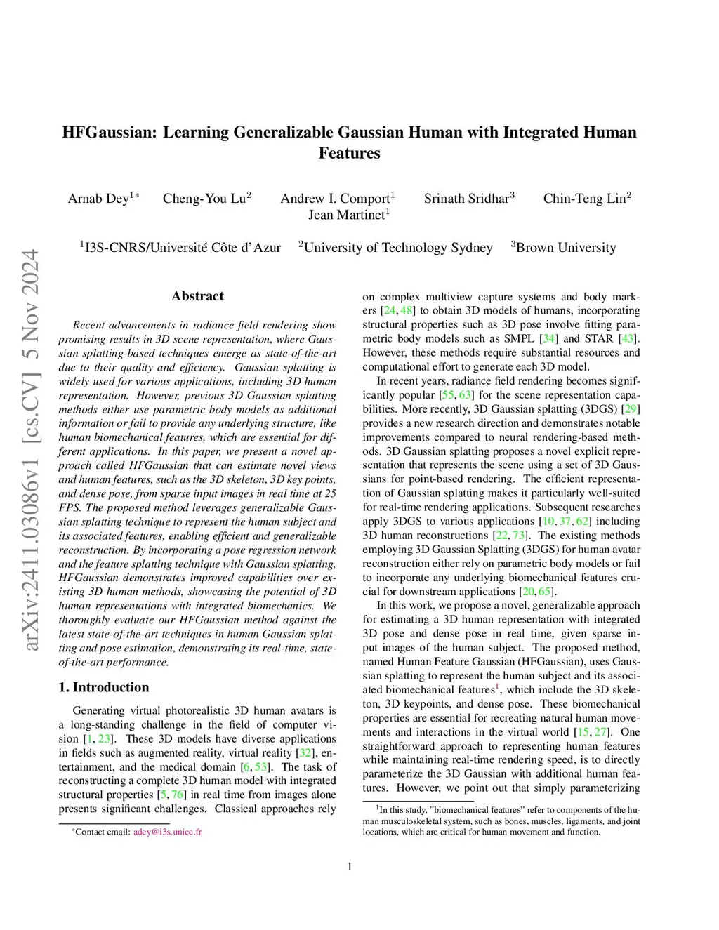 Recent advancements in radiance field rendering show promising results in 3D scene representation, where Gaussian splatting-based techniques emerge as state-of-the-art due to their quality and efficiency. Gaussian splatting is widely used for various applications, including 3D human representation. However, previous 3D Gaussian splatting methods either use parametric body models as additional information or fail to provide any underlying structure, like human biomechanical features, which are essential for different applications. In this paper, we present a novel approach called HFGaussian that can estimate novel views and human features, such as the 3D skeleton, 3D key points, and dense pose, from sparse input images in real time at 25 FPS. The proposed method leverages generalizable Gaussian splatting technique to represent the human subject and its associated features, enabling efficient and generalizable reconstruction. By incorporating a pose regression network and the feature splatting technique with Gaussian splatting, HFGaussian demonstrates improved capabilities over existing 3D human methods, showcasing the potential of 3D human representations with integrated biomechanics. We thoroughly evaluate our HFGaussian method against the latest state-of-the-art techniques in human Gaussian splatting and pose estimation, demonstrating its real-time, state-of-the-art performance.