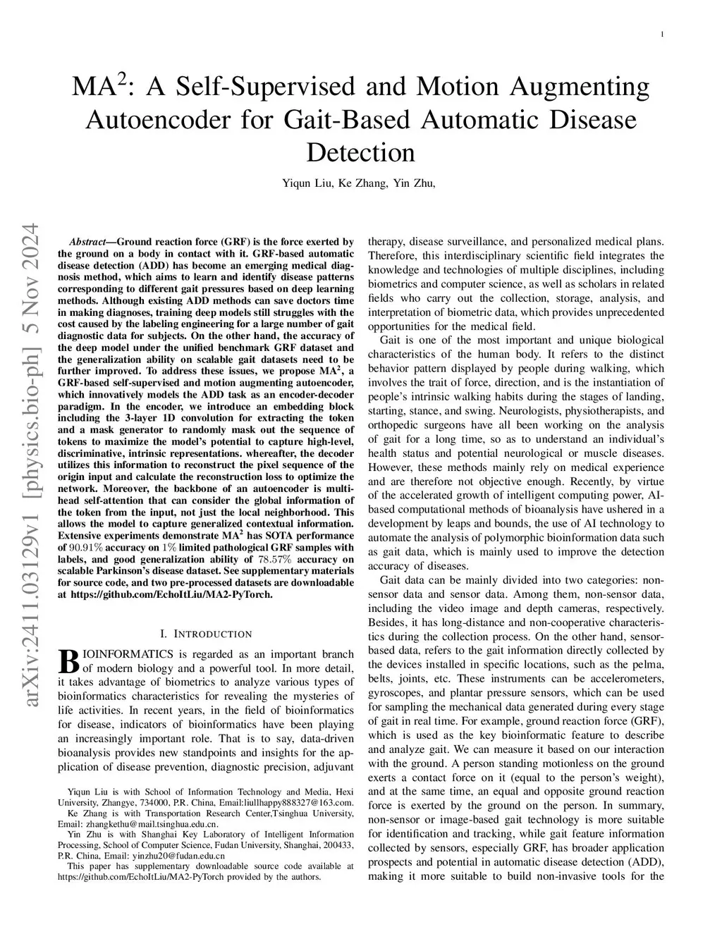 Ground reaction force (GRF) is the force exerted by the ground on a body in contact with it. GRF-based automatic disease detection (ADD) has become an emerging medical diagnosis method, which aims to learn and identify disease patterns corresponding to different gait pressures based on deep learning methods. Although existing ADD methods can save doctors time in making diagnoses, training deep models still struggles with the cost caused by the labeling engineering for a large number of gait diagnostic data for subjects. On the other hand, the accuracy of the deep model under the unified benchmark GRF dataset and the generalization ability on scalable gait datasets need to be further improved. To address these issues, we propose MA2, a GRF-based self-supervised and motion augmenting auto-encoder, which models the ADD task as an encoder-decoder paradigm. In the encoder, we introduce an embedding block including the 3-layer 1D convolution for extracting the token and a mask generator to randomly mask out the sequence of tokens to maximize the model's potential to capture high-level, discriminative, intrinsic representations. whereafter, the decoder utilizes this information to reconstruct the pixel sequence of the origin input and calculate the reconstruction loss to optimize the network. Moreover, the backbone of an auto-encoder is multi-head self-attention that can consider the global information of the token from the input, not just the local neighborhood. This allows the model to capture generalized contextual information. Extensive experiments demonstrate MA2 has SOTA performance of 90.91% accuracy on 1% limited pathological GRF samples with labels, and good generalization ability of 78.57% accuracy on scalable Parkinson disease dataset.