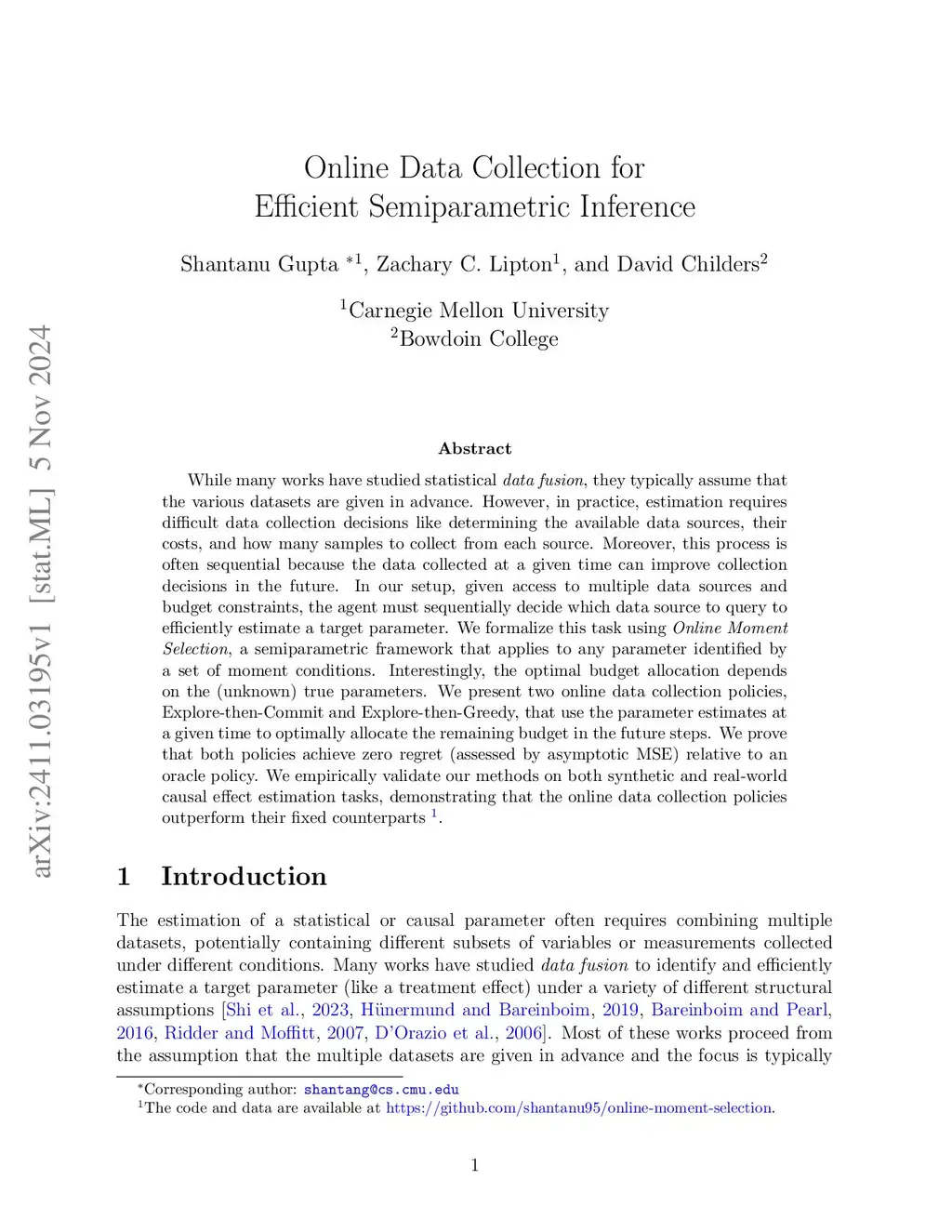 While many works have studied statistical data fusion, they typically assume that the various datasets are given in advance. However, in practice, estimation requires difficult data collection decisions like determining the available data sources, their costs, and how many samples to collect from each source. Moreover, this process is often sequential because the data collected at a given time can improve collection decisions in the future. In our setup, given access to multiple data sources and budget constraints, the agent must sequentially decide which data source to query to efficiently estimate a target parameter. We formalize this task using Online Moment Selection, a semiparametric framework that applies to any parameter identified by a set of moment conditions. Interestingly, the optimal budget allocation depends on the (unknown) true parameters. We present two online data collection policies, Explore-then-Commit and Explore-then-Greedy, that use the parameter estimates at a given time to optimally allocate the remaining budget in the future steps. We prove that both policies achieve zero regret (assessed by asymptotic MSE) relative to an oracle policy. We empirically validate our methods on both synthetic and real-world causal effect estimation tasks, demonstrating that the online data collection policies outperform their fixed counterparts.