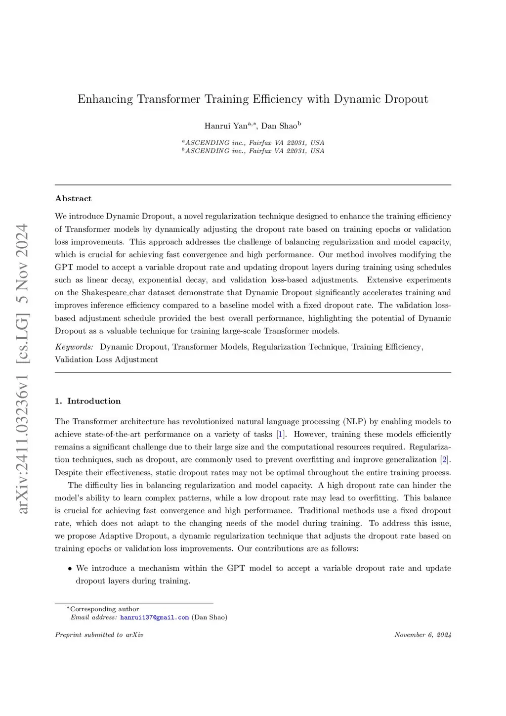 We introduce Dynamic Dropout, a novel regularization technique designed to enhance the training efficiency of Transformer models by dynamically adjusting the dropout rate based on training epochs or validation loss improvements. This approach addresses the challenge of balancing regularization and model capacity, which is crucial for achieving fast convergence and high performance. Our method involves modifying the GPT model to accept a variable dropout rate and updating dropout layers during training using schedules such as linear decay, exponential decay, and validation loss-based adjustments. Extensive experiments on the Shakespeare\_char dataset demonstrate that Dynamic Dropout significantly accelerates training and improves inference efficiency compared to a baseline model with a fixed dropout rate. The validation loss-based adjustment schedule provided the best overall performance, highlighting the potential of Dynamic Dropout as a valuable technique for training large-scale Transformer models.