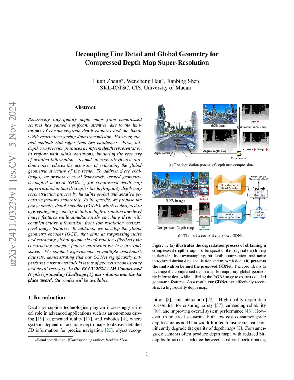 Decoupling Fine Detail and Global Geometry for Compressed Depth Map Super-Resolution