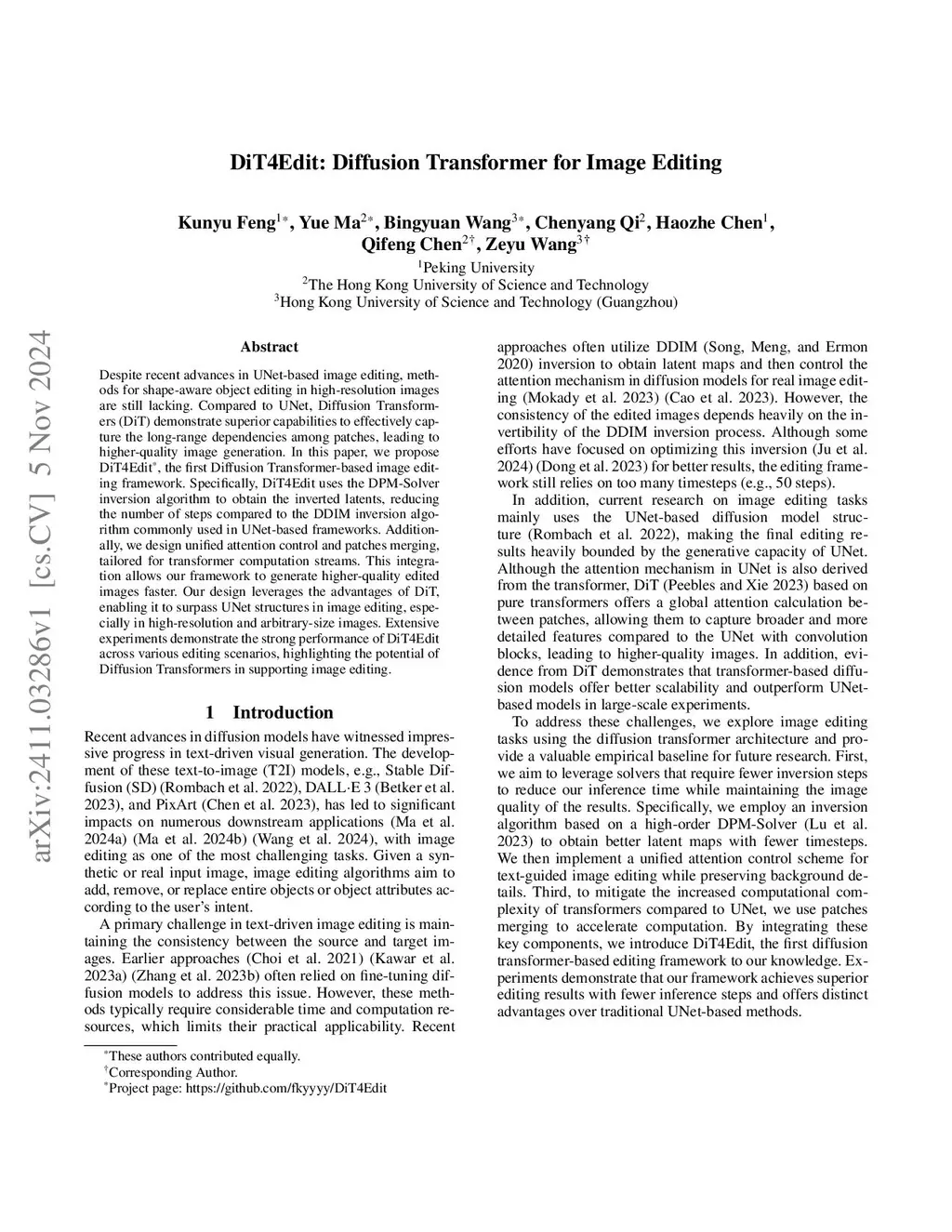 Despite recent advances in UNet-based image editing, methods for shape-aware object editing in high-resolution images are still lacking. Compared to UNet, Diffusion Transformers (DiT) demonstrate superior capabilities to effectively capture the long-range dependencies among patches, leading to higher-quality image generation. In this paper, we propose DiT4Edit, the first Diffusion Transformer-based image editing framework. Specifically, DiT4Edit uses the DPM-Solver inversion algorithm to obtain the inverted latents, reducing the number of steps compared to the DDIM inversion algorithm commonly used in UNet-based frameworks. Additionally, we design unified attention control and patches merging, tailored for transformer computation streams. This integration allows our framework to generate higher-quality edited images faster. Our design leverages the advantages of DiT, enabling it to surpass UNet structures in image editing, especially in high-resolution and arbitrary-size images. Extensive experiments demonstrate the strong performance of DiT4Edit across various editing scenarios, highlighting the potential of Diffusion Transformers in supporting image editing.