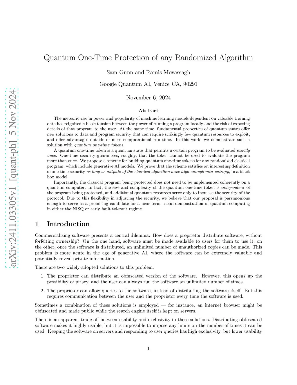 The meteoric rise in power and popularity of machine learning models dependent on valuable training data has reignited a basic tension between the power of running a program locally and the risk of exposing details of that program to the user. At the same time, fundamental properties of quantum states offer new solutions to data and program security that can require strikingly few quantum resources to exploit, and offer advantages outside of mere computational run time. In this work, we demonstrate such a solution with quantum one-time tokens. A quantum one-time token is a quantum state that permits a certain program to be evaluated exactly once. One-time security guarantees, roughly, that the token cannot be used to evaluate the program more than once. We propose a scheme for building quantum one-time tokens for any randomized classical program, which include generative AI models. We prove that the scheme satisfies an interesting definition of one-time security as long as outputs of the classical algorithm have high enough min-entropy, in a black box model. Importantly, the classical program being protected does not need to be implemented coherently on a quantum computer. In fact, the size and complexity of the quantum one-time token is independent of the program being protected, and additional quantum resources serve only to increase the security of the protocol. Due to this flexibility in adjusting the security, we believe that our proposal is parsimonious enough to serve as a promising candidate for a near-term useful demonstration of quantum computing in either the NISQ or early fault tolerant regime.