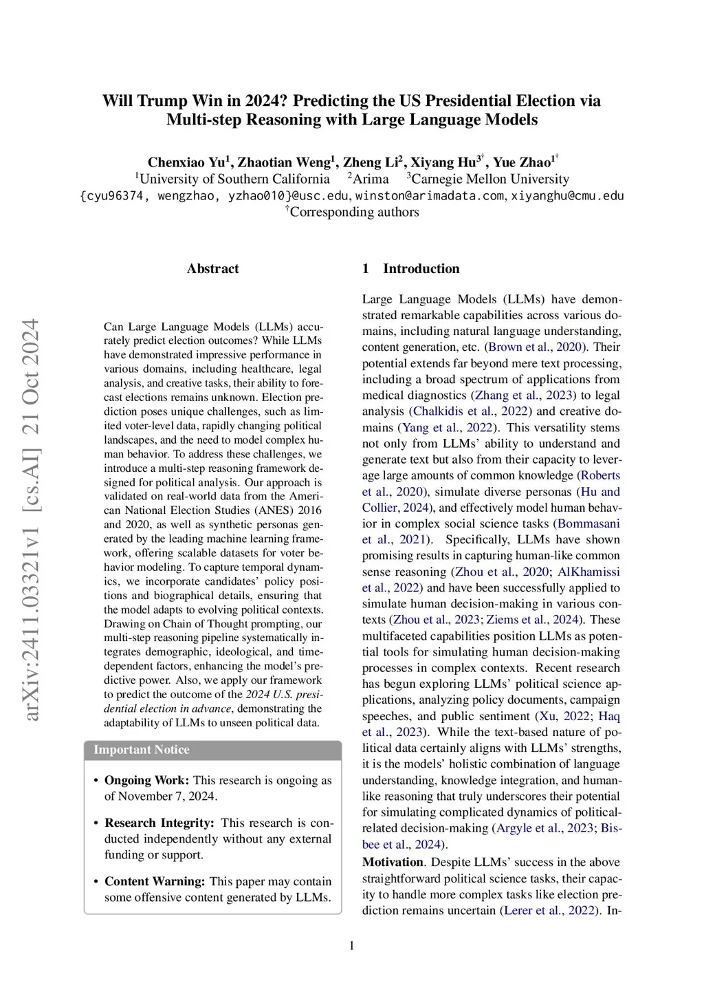 Can Large Language Models (LLMs) accurately predict election outcomes? While LLMs have demonstrated impressive performance in various domains, including healthcare, legal analysis, and creative tasks, their ability to forecast elections remains unknown. Election prediction poses unique challenges, such as limited voter-level data, rapidly changing political landscapes, and the need to model complex human behavior. To address these challenges, we introduce a multi-step reasoning framework designed for political analysis. Our approach is validated on real-world data from the American National Election Studies (ANES) 2016 and 2020, as well as synthetic personas generated by the leading machine learning framework, offering scalable datasets for voter behavior modeling. To capture temporal dynamics, we incorporate candidates' policy positions and biographical details, ensuring that the model adapts to evolving political contexts. Drawing on Chain of Thought prompting, our multi-step reasoning pipeline systematically integrates demographic, ideological, and time-dependent factors, enhancing the model's predictive power.