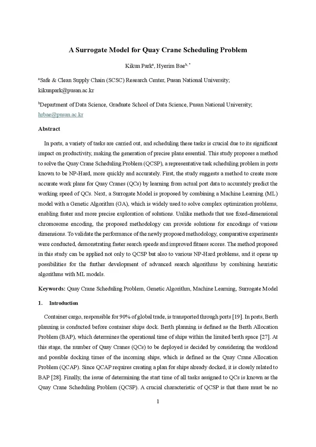 In ports, a variety of tasks are carried out, and scheduling these tasks is crucial due to its significant impact on productivity, making the generation of precise plans essential. This study proposes a method to solve the Quay Crane Scheduling Problem (QCSP), a representative task scheduling problem in ports known to be NP-Hard, more quickly and accurately. First, the study suggests a method to create more accurate work plans for Quay Cranes (QCs) by learning from actual port data to accurately predict the working speed of QCs. Next, a Surrogate Model is proposed by combining a Machine Learning (ML) model with a Genetic Algorithm (GA), which is widely used to solve complex optimization problems, enabling faster and more precise exploration of solutions. Unlike methods that use fixed-dimensional chromosome encoding, the proposed methodology can provide solutions for encodings of various dimensions. To validate the performance of the newly proposed methodology, comparative experiments were conducted, demonstrating faster search speeds and improved fitness scores. The method proposed in this study can be applied not only to QCSP but also to various NP-Hard problems, and it opens up possibilities for the further development of advanced search algorithms by combining heuristic algorithms with ML models.