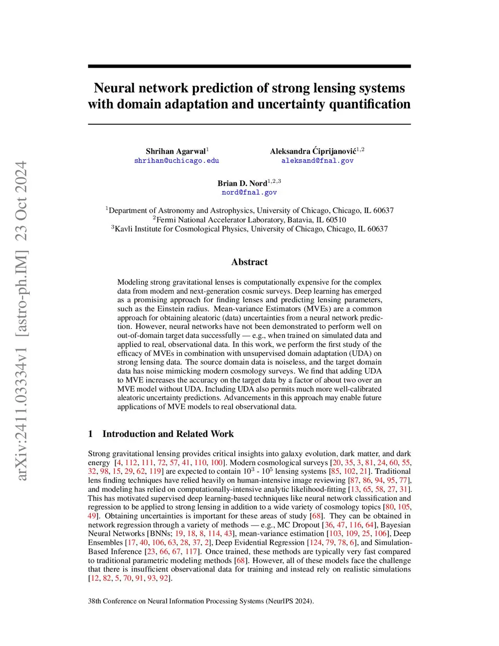 Neural Network Prediction of Strong Lensing Systems with Domain Adaptation and Uncertainty Quantification
