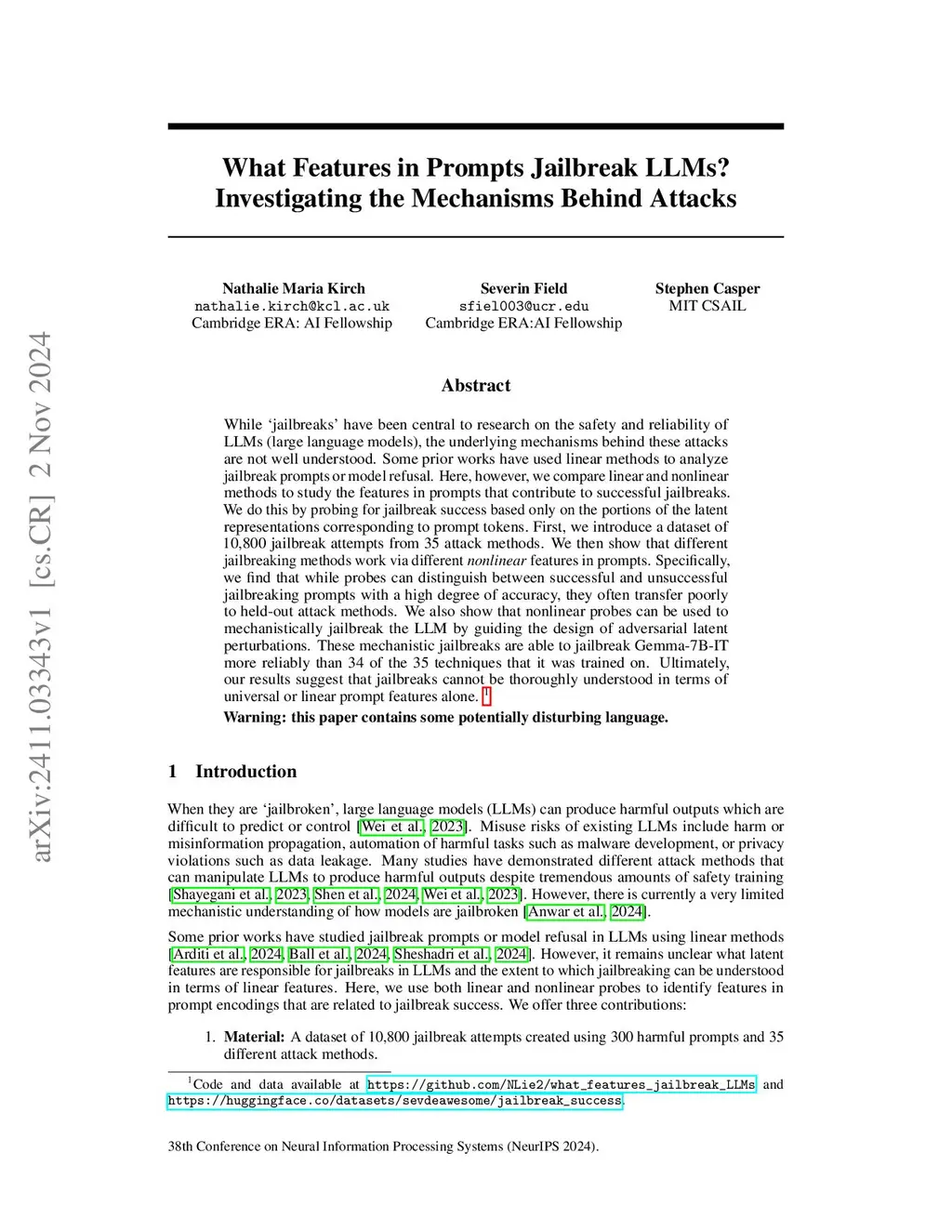 Jailbreaks have been a central focus of research regarding the safety and reliability of large language models (LLMs), yet the mechanisms underlying these attacks remain poorly understood. While previous studies have predominantly relied on linear methods to detect jailbreak attempts and model refusals, we take a different approach by examining both linear and non-linear features in prompts that lead to successful jailbreaks. First, we introduce a novel dataset comprising 10,800 jailbreak attempts spanning 35 diverse attack methods. Leveraging this dataset, we train linear and non-linear probes on hidden states of open-weight LLMs to predict jailbreak success. Probes achieve strong in-distribution accuracy but transfer is attack-family-specific, revealing that different jailbreaks are supported by distinct internal mechanisms rather than a single universal direction. To establish causal relevance, we construct probe-guided latent interventions that systematically shift compliance in the predicted direction. Interventions derived from non-linear probes produce larger and more reliable effects than those from linear probes, indicating that features linked to jailbreak success are encoded non-linearly in prompt representations. Overall, the results surface heterogeneous, non-linear structure in jailbreak mechanisms and provide a prompt-side methodology for recovering and testing the features that drive jailbreak outcomes.