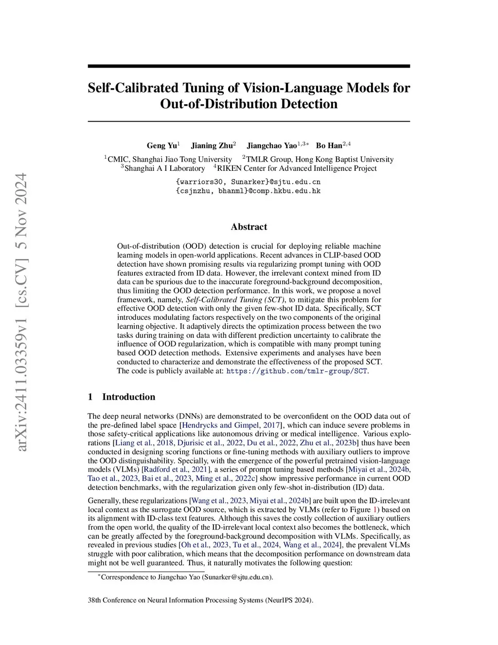 Out-of-distribution (OOD) detection is crucial for deploying reliable machine learning models in open-world applications. Recent advances in CLIP-based OOD detection have shown promising results via regularizing prompt tuning with OOD features extracted from ID data. However, the irrelevant context mined from ID data can be spurious due to the inaccurate foreground-background decomposition, thus limiting the OOD detection performance. In this work, we propose a novel framework, namely, Self-Calibrated Tuning (SCT), to mitigate this problem for effective OOD detection with only the given few-shot ID data. Specifically, SCT introduces modulating factors respectively on the two components of the original learning objective. It adaptively directs the optimization process between the two tasks during training on data with different prediction uncertainty to calibrate the influence of OOD regularization, which is compatible with many prompt tuning based OOD detection methods. Extensive experiments and analyses have been conducted to characterize and demonstrate the effectiveness of the proposed SCT. The code is publicly available.