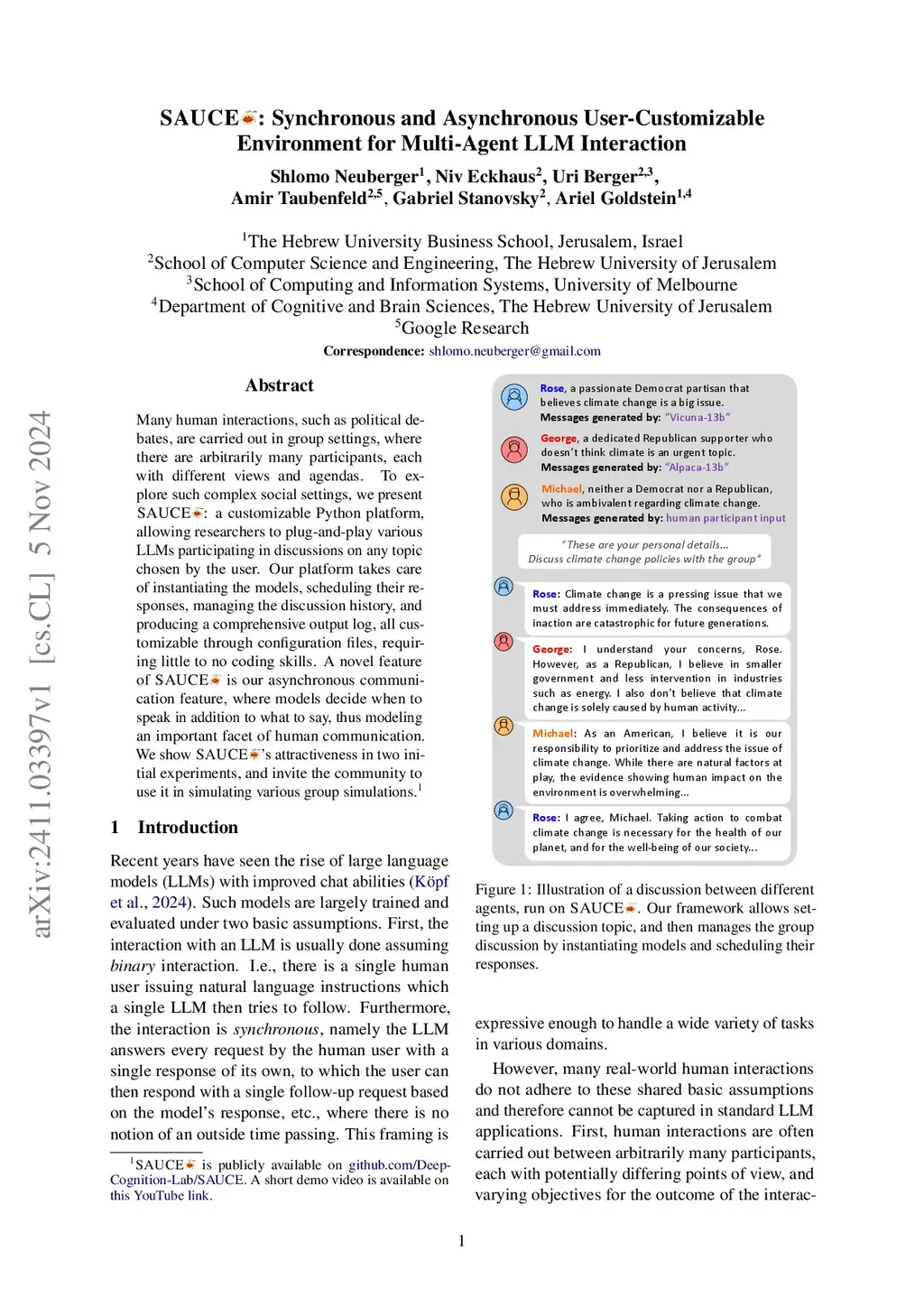 Many human interactions, such as political debates, are carried out in group settings, where there are arbitrarily many participants, each with different views and agendas. To explore such complex social settings, we present SAUCE: a customizable Python platform, allowing researchers to plug-and-play various LLMs participating in discussions on any topic chosen by the user. Our platform takes care of instantiating the models, scheduling their responses, managing the discussion history, and producing a comprehensive output log, all customizable through configuration files, requiring little to no coding skills. A novel feature of SAUCE is our asynchronous communication feature, where models decide when to speak in addition to what to say, thus modeling an important facet of human communication. We show SAUCE's attractiveness in two initial experiments, and invite the community to use it in simulating various group simulations.
