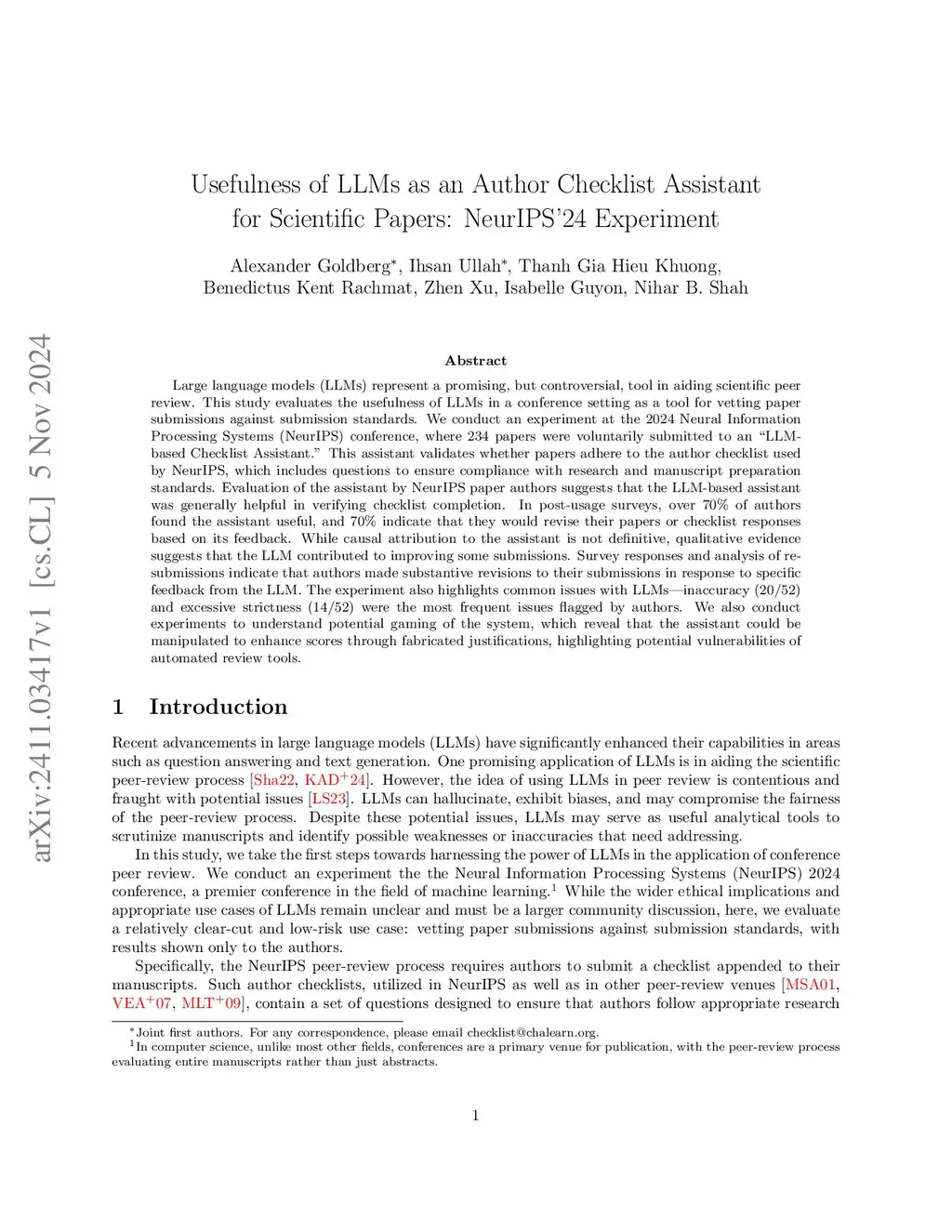 Large language models (LLMs) represent a promising, but controversial, tool in aiding scientific peer review. This study evaluates the usefulness of LLMs in a conference setting as a tool for vetting paper submissions against submission standards. We conduct an experiment at the 2024 Neural Information Processing Systems (NeurIPS) conference, where 234 papers were voluntarily submitted to an "LLM-based Checklist Assistant." This assistant validates whether papers adhere to the author checklist used by NeurIPS, which includes questions to ensure compliance with research and manuscript preparation standards. Evaluation of the assistant by NeurIPS paper authors suggests that the LLM-based assistant was generally helpful in verifying checklist completion. In post-usage surveys, over 70% of authors found the assistant useful, and 70% indicate that they would revise their papers or checklist responses based on its feedback. While causal attribution to the assistant is not definitive, qualitative evidence suggests that the LLM contributed to improving some submissions. Survey responses and analysis of re-submissions indicate that authors made substantive revisions to their submissions in response to specific feedback from the LLM. The experiment also highlights common issues with LLMs: inaccuracy (20/52) and excessive strictness (14/52) were the most frequent issues flagged by authors. We also conduct experiments to understand potential gaming of the system, which reveal that the assistant could be manipulated to enhance scores through fabricated justifications, highlighting potential vulnerabilities of automated review tools.