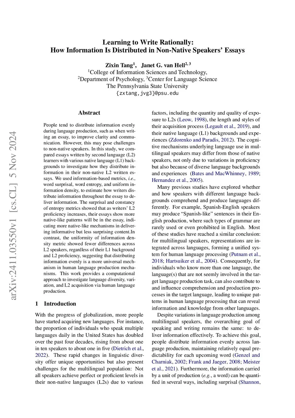 People tend to distribute information evenly in language production for better and clearer communication. In this study, we compared essays written by second language learners with various native language (L1) backgrounds to investigate how they distribute information in their non-native language (L2) production. Analyses of surprisal and constancy of entropy rate indicated that writers with higher L2 proficiency can reduce the expected uncertainty of language production while still conveying informative content. However, the uniformity of information distribution showed less variability among different groups of L2 speakers, suggesting that this feature may be universal in L2 essay writing and less affected by L2 writers' variability in L1 background and L2 proficiency.