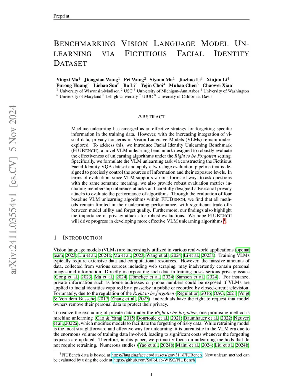 Benchmarking Vision Language Model Unlearning via Fictitious Facial Identity Dataset