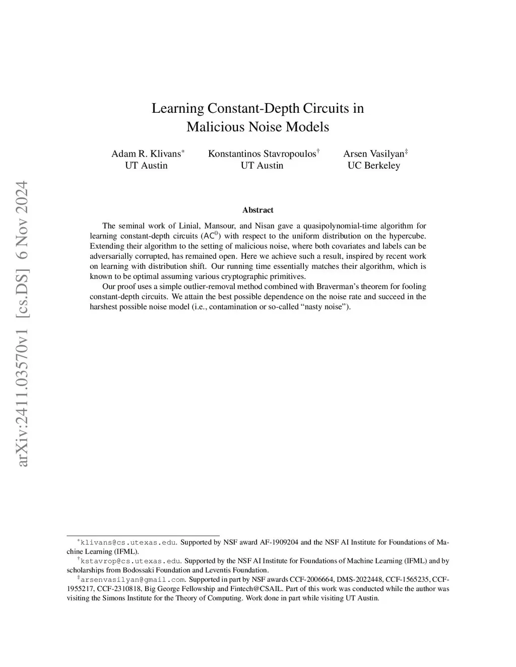 The seminal work of Linial, Mansour, and Nisan gave a quasipolynomial-time algorithm for learning constant-depth circuits () with respect to the uniform distribution on the hypercube. Extending their algorithm to the setting of malicious noise, where both covariates and labels can be adversarially corrupted, has remained open. Here we achieve such a result, inspired by recent work on learning with distribution shift. Our running time essentially matches their algorithm, which is known to be optimal assuming various cryptographic primitives. Our proof uses a simple outlier-removal method combined with Braverman's theorem for fooling constant-depth circuits. We attain the best possible dependence on the noise rate and succeed in the harshest possible noise model (i.e., contamination or so-called "nasty noise").