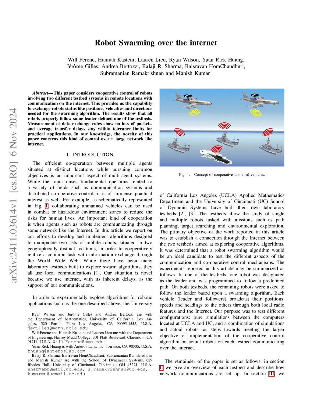 This paper considers cooperative control of robots involving two different testbed systems in remote locations with communication on the internet. This provides us the capability to exchange robots status like positions, velocities and directions needed for the swarming algorithm. The results show that all robots properly follow some leader defined one of the testbeds. Measurement of data exchange rates show no loss of packets, and average transfer delays stay within tolerance limits for practical applications. In our knowledge, the novelty of this paper concerns this kind of control over a large network like internet.