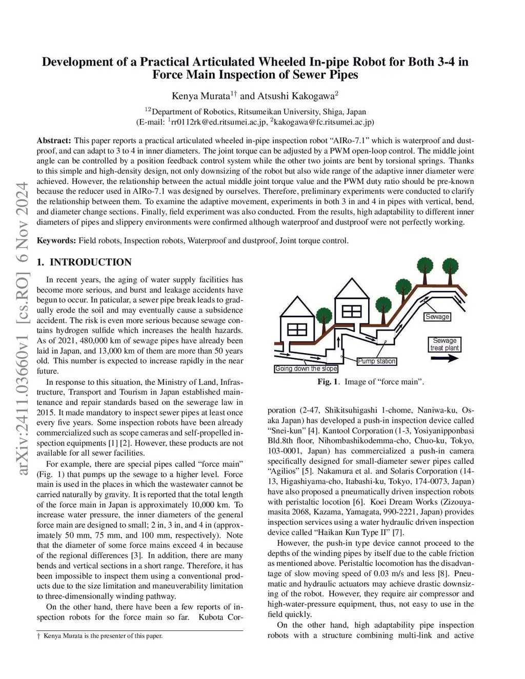 This paper reports a practical articulated wheeled in-pipe inspection robot "AIRo-7.1" which is waterproof and dustproof, and can adapt to 3 to 4 in inner diameters. The joint torque can be adjusted by a PWM open-loop control. The middle joint angle can be controlled by a position feedback control system while the other two joints are bent by torsional springs. Thanks to this simple and high-density design, not only downsizing of the robot but also wide range of the adaptive inner diameter were achieved. However, the relationship between the actual middle joint torque value and the PWM duty ratio should be pre-known because the reducer used in AIRo-7.1 was designed by ourselves. Therefore, preliminary experiments were conducted to clarify the relationship between them. To examine the adaptive movement, experiments in both 3 in and 4 in pipes with vertical, bend, and diameter change sections. Finally, field experiment was also conducted. From the results, high adaptability to different inner diameters of pipes and slippery environments were confirmed although waterproof and dustproof were not perfectly working.