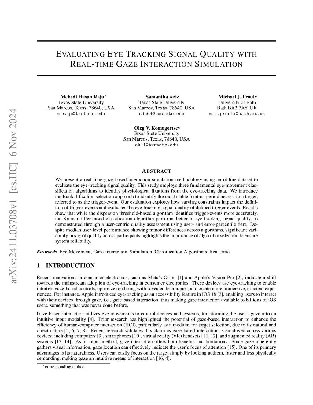 We present a real-time gaze-based interaction simulation methodology using an offline dataset to evaluate the eye-tracking signal quality. This study employs three fundamental eye-movement classification algorithms to identify physiological fixations from the eye-tracking data. We introduce the Rank-1 fixation selection approach to identify the most stable fixation period nearest to a target, referred to as the trigger-event. Our evaluation explores how varying constraints impact the definition of trigger-events and evaluates the eye-tracking signal quality of defined trigger-events. Results show that while the dispersion threshold-based algorithm identifies trigger-events more accurately, the Kalman filter-based classification algorithm performs better in eye-tracking signal quality, as demonstrated through a user-centric quality assessment using user- and error-percentile tiers. Despite median user-level performance showing minor differences across algorithms, significant variability in signal quality across participants highlights the importance of algorithm selection to ensure system reliability.