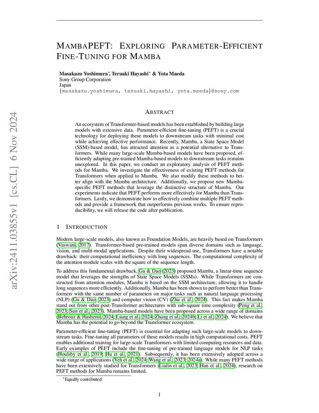 An ecosystem of Transformer-based models has been established by building large models with extensive data. Parameter-efficient fine-tuning (PEFT) is a crucial technology for deploying these models to downstream tasks with minimal cost while achieving effective performance. Recently, Mamba, a State Space Model (SSM)-based model, has attracted attention as a potential alternative to Transformers. While many large-scale Mamba-based models have been proposed, efficiently adapting pre-trained Mamba-based models to downstream tasks remains unexplored. In this paper, we conduct an exploratory analysis of PEFT methods for Mamba. We investigate the effectiveness of existing PEFT methods for Transformers when applied to Mamba. We also modify these methods to better align with the Mamba architecture. Additionally, we propose new Mamba-specific PEFT methods that leverage the distinctive structure of Mamba. Our experiments indicate that PEFT performs more effectively for Mamba than Transformers. Lastly, we demonstrate how to effectively combine multiple PEFT methods and provide a framework that outperforms previous works. To ensure reproducibility, we will release the code after publication.