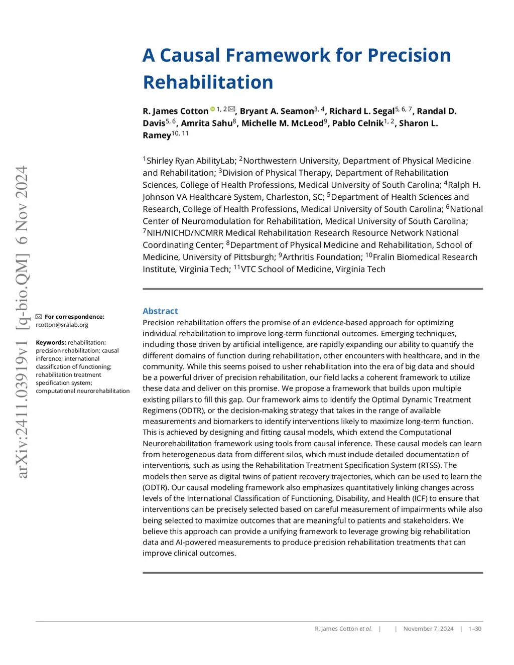Precision rehabilitation offers the promise of an evidence-based approach for optimizing individual rehabilitation to improve long-term functional outcomes. Emerging techniques, including those driven by artificial intelligence, are rapidly expanding our ability to quantify the different domains of function during rehabilitation, other encounters with healthcare, and in the community. While this seems poised to usher rehabilitation into the era of big data and should be a powerful driver of precision rehabilitation, our field lacks a coherent framework to utilize these data and deliver on this promise. We propose a framework that builds upon multiple existing pillars to fill this gap. Our framework aims to identify the Optimal Dynamic Treatment Regimens (ODTR), or the decision-making strategy that takes in the range of available measurements and biomarkers to identify interventions likely to maximize long-term function. This is achieved by designing and fitting causal models, which extend the Computational Neurorehabilitation framework using tools from causal inference. These causal models can learn from heterogeneous data from different silos, which must include detailed documentation of interventions, such as using the Rehabilitation Treatment Specification System. The models then serve as digital twins of patient recovery trajectories, which can be used to learn the ODTR. Our causal modeling framework also emphasizes quantitatively linking changes across levels of the functioning to ensure that interventions can be precisely selected based on careful measurement of impairments while also being selected to maximize outcomes that are meaningful to patients and stakeholders. We believe this approach can provide a unifying framework to leverage growing big rehabilitation data and AI-powered measurements to produce precision rehabilitation treatments that can improve clinical outcomes.