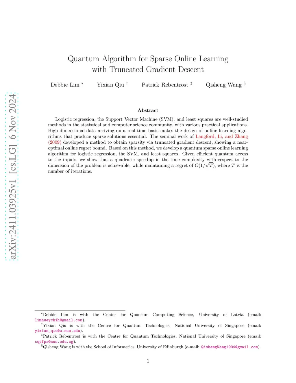 Logistic regression, the Support Vector Machine (SVM), and least squares are well-studied methods in the statistical and computer science community, with various practical applications. High-dimensional data arriving on a real-time basis makes the design of online learning algorithms that produce sparse solutions essential. The seminal work of \hyperlink{cite.langford2009sparse}{Langford, Li, and Zhang (2009)} developed a method to obtain sparsity via truncated gradient descent, showing a near-optimal online regret bound. Based on this method, we develop a quantum sparse online learning algorithm for logistic regression, the SVM, and least squares. Given efficient quantum access to the inputs, we show that a quadratic speedup in the time complexity with respect to the dimension of the problem is achievable, while maintaining a regret of , where is the number of iterations.