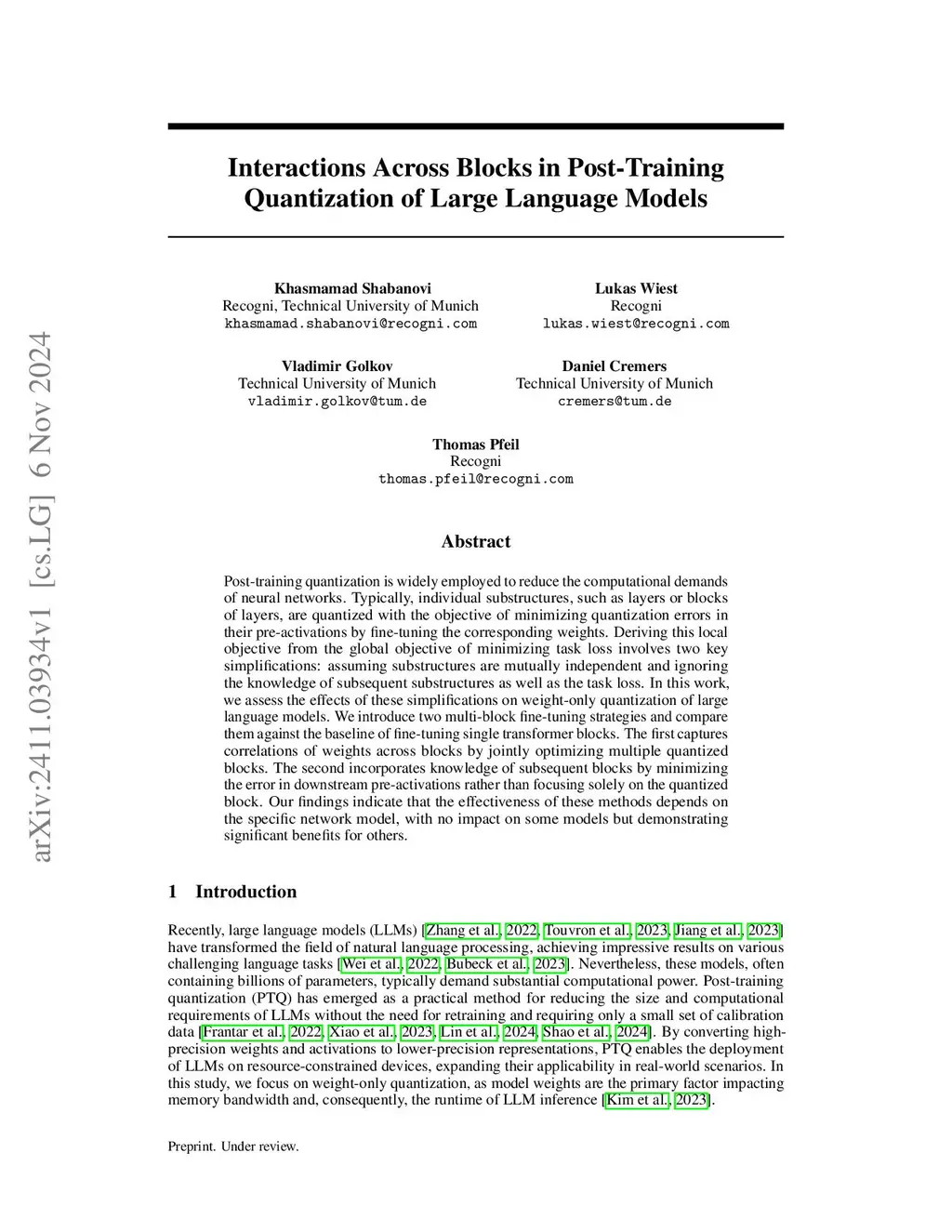 Interactions Across Blocks in Post-Training Quantization of Large