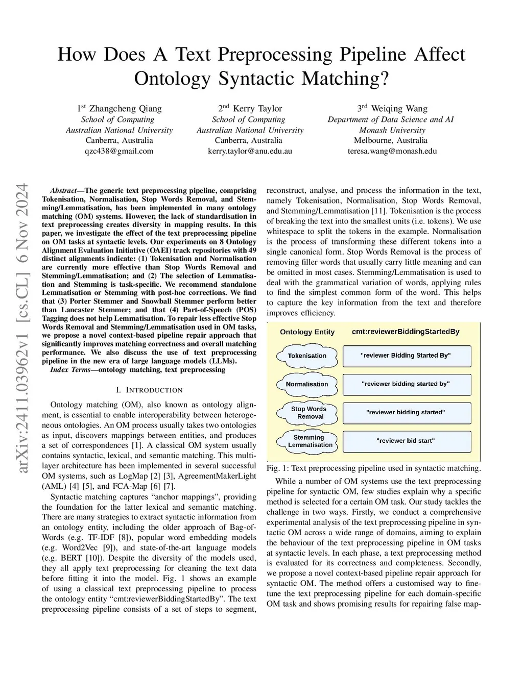 How Does A Text Preprocessing Pipeline Affect Ontology Syntactic Matching?