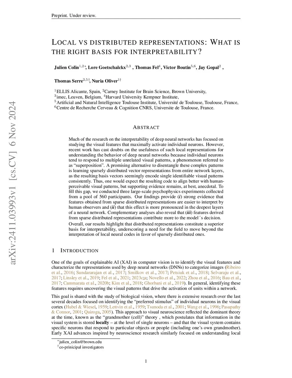 Much of the research on the interpretability of deep neural networks has focused on studying the visual features that maximally activate individual neurons. However, recent work has cast doubts on the usefulness of such local representations for understanding the behavior of deep neural networks because individual neurons tend to respond to multiple unrelated visual patterns, a phenomenon referred to as "superposition". A promising alternative to disentangle these complex patterns is learning sparsely distributed vector representations from entire network layers, as the resulting basis vectors seemingly encode single identifiable visual patterns consistently. Thus, one would expect the resulting code to align better with human perceivable visual patterns, but supporting evidence remains, at best, anecdotal. To fill this gap, we conducted three large-scale psychophysics experiments collected from a pool of 560 participants. Our findings provide (i) strong evidence that features obtained from sparse distributed representations are easier to interpret by human observers and (ii) that this effect is more pronounced in the deepest layers of a neural network. Complementary analyses also reveal that (iii) features derived from sparse distributed representations contribute more to the model's decision. Overall, our results highlight that distributed representations constitute a superior basis for interpretability, underscoring a need for the field to move beyond the interpretation of local neural codes in favor of sparsely distributed ones.