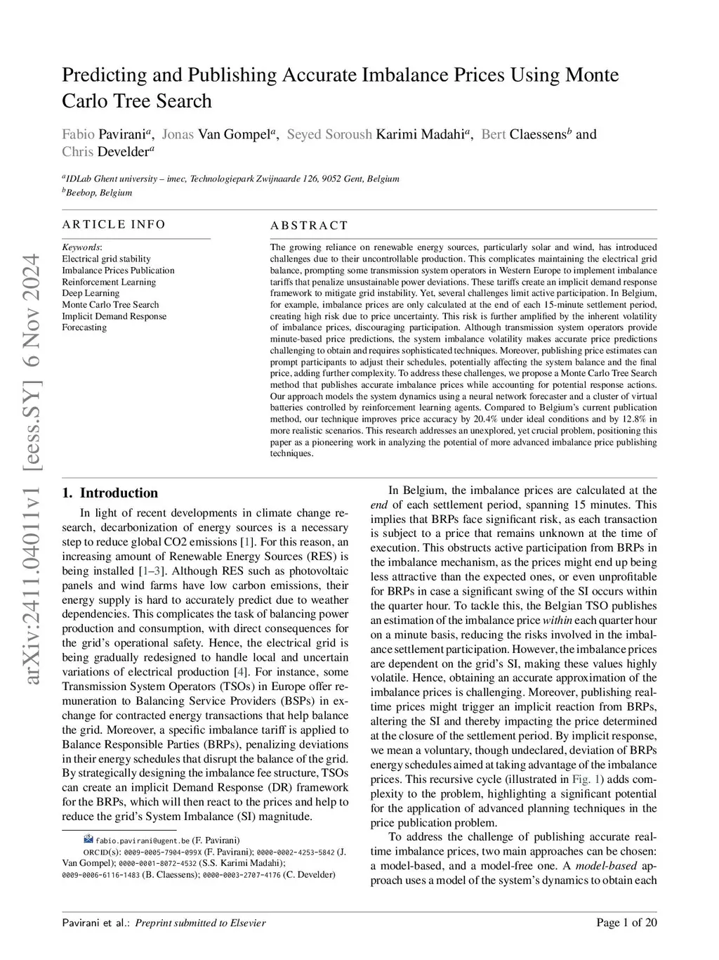 Predicting and Publishing Accurate Imbalance Prices Using Monte Carlo Tree Search